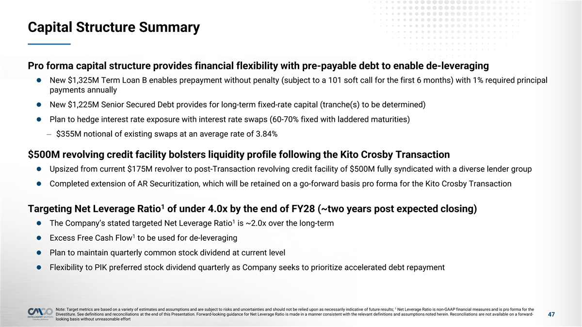 Financial Policy l Management and Board’s #1 priority post-transaction will be de-leveraging 1,2 l Intend to use near-term Free Cash Flow to de-leverage Leverage 1 l The Company’s stated targeted Net Leverage Ratio is ~2.0x over the long run l Continue to re-invest in business to drive growth in margin-accretive product platforms Capital l Target ~2.5% of net sales for capital expenditures, with expected ability to flex lower to ~1.0% in response to economic conditions Allocation l No material M&A expected to be pursued outside of the pending Kito Crosby transaction (and the Divestiture) while the Company prioritizes using cash flow to repay debt M&A l Continued focus on de-leveraging the balance sheet for the near term l Maintain ample liquidity, including cash and availability under the Revolving Credit Facility and AR securitization Liquidity l Target cash balance around ~$85M to drive lower interest expense, offset by availability under the AR securitization l Continue to pay regular quarterly dividend Shareholder l No share repurchases planned in the near term Distributions 1 Note: Target metrics are based on a variety of estimates and assumptions and are subject to risks and uncertainties and should not be relied upon as necessarily indicative of future results; Net Leverage Ratio and Free Cash Flow are non-GAAP financial measures and are pro forma for the Divestiture. See definitions and reconciliations at the end of this Presentation. Forward-looking guidance for Net Leverage Ratio is made in a manner consistent with the relevant definitions and assumptions noted herein, but reconciliations are not included 46 2 because such reconciliations could not be produced without unreasonable effort; Free Cash Flow is defined as net cash provided by (used for) operating activities less capital expenditures
