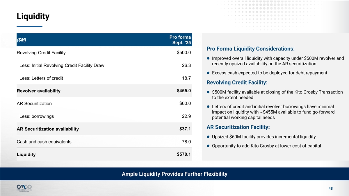 Liquidity Pro forma ($M) Sept. '25 Pro Forma Liquidity Considerations: Revolving Credit Facility $500.0 l Improved overall liquidity with capacity under $500M revolver and recently upsized availability on the AR securitization Less: Initial Revolving Credit Facility Draw 26.3 l Excess cash expected to be deployed for debt repayment Less: Letters of credit 18.7 Revolving Credit Facility: $455.0 Revolver availability l $500M facility available at closing of the Kito Crosby Transaction to the extent needed $60.0 AR Securitization l Letters of credit and initial revolver borrowings have minimal impact on liquidity with ~$455M available to fund go-forward Less: borrowings 22.9 potential working capital needs AR Securitization Facility: $37.1 AR Securitization availability l Upsized $60M facility provides incremental liquidity Cash and cash equivalents 78.0 l Opportunity to add Kito Crosby at lower cost of capital $570.1 Liquidity Ample Liquidity Provides Further Flexibility 48
