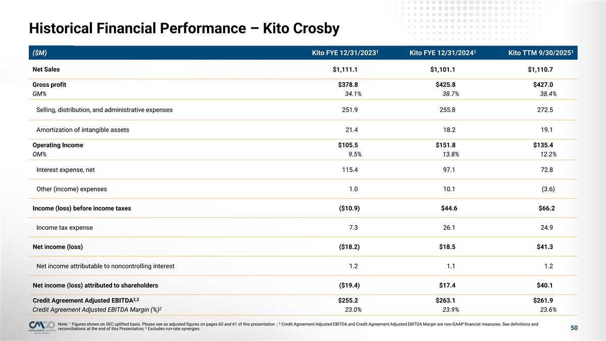 Historical Financial Performance – Kito Crosby 1 1 1 ($M) Kito FYE 12/31/2023 Kito FYE 12/31/2024 Kito TTM 9/30/2025 Net Sales $1,111.1 $1,101.1 $1,110.7 Gross profit $378.8.. $425.8.. $427.0.. GM% 34.1% 38.7% 38.4% Selling, distribution, and administrative expenses 251.9 255.8 272.5 Amortization of intangible assets 21.4 18.2 19.1 Operating Income $105.5.. $151.8.. $135.4.. OM% 9.5% 13.8% 12.2% Interest expense, net 115.4 97.1 72.8 Other (income) expenses 1.0 10.1 (3.6) Income (loss) before income taxes ($10.9) $44.6 $66.2 Income tax expense 7.3 26.1 24.9 Net income (loss) ($18.2) $18.5 $41.3 Net income attributable to noncontrolling interest 1.2 1.1 1.2 Net income (loss) attributed to shareholders ($19.4) $17.4 $40.1 2,3 Credit Agreement Adjusted EBITDA $255.2.. ..$263.1.. $261.9.. 2 Credit Agreement Adjusted EBITDA Margin (%) 23.0% 23.9% 23.6% 1 2 Note: Figures shown on SEC uplifted basis. Please see as adjusted figures on pages 60 and 61 of this presentation ; Credit Agreement Adjusted EBITDA and Credit Agreement Adjusted EBITDA Margin are non-GAAP financial measures. See definitions and 3 50 reconciliations at the end of this Presentation; Excludes run-rate synergies