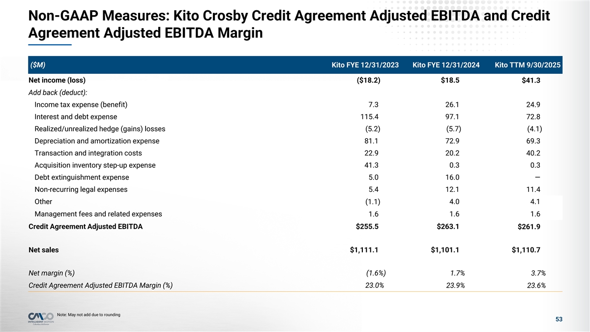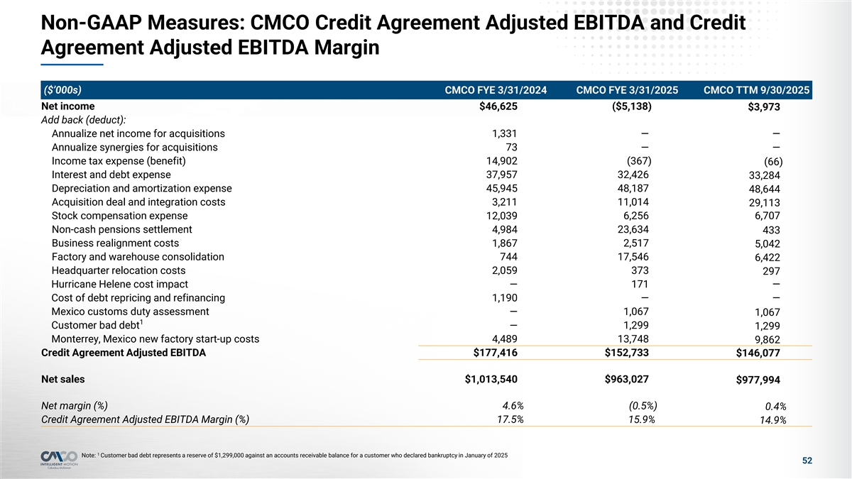 Non-GAAP Measures: CMCO Credit Agreement Adjusted EBITDA and Credit Agreement Adjusted EBITDA Margin ($’000s) CMCO FYE 3/31/2024 CMCO FYE 3/31/2025 CMCO TTM 9/30/2025 Net income $46,625 ($5,138) $3,973 Add back (deduct): Annualize net income for acquisitions 1,331 — — Annualize synergies for acquisitions 73 — — Income tax expense (benefit) 14,902 (367) (66) Interest and debt expense 37,957 32,426 33,284 Depreciation and amortization expense 45,945 48,187 48,644 Acquisition deal and integration costs 3,211 11,014 29,113 Stock compensation expense 12,039 6,256 6,707 Non-cash pensions settlement 4,984 23,634 433 Business realignment costs 1,867 2,517 5,042 Factory and warehouse consolidation 744 17,546 6,422 Headquarter relocation costs 2,059 373 297 Hurricane Helene cost impact — 171 — Cost of debt repricing and refinancing 1,190 — — Mexico customs duty assessment — 1,067 1,067 1 Customer bad debt — 1,299 1,299 Monterrey, Mexico new factory start-up costs 4,489 13,748 9,862 Credit Agreement Adjusted EBITDA $177,416 $152,733 $146,077 Net sales $1,013,540 $963,027 $977,994 Net margin (%) 4.6% (0.5%) 0.4% Credit Agreement Adjusted EBITDA Margin (%) 17.5% 15.9% 14.9% 1 Note: Customer bad debt represents a reserve of $1,299,000 against an accounts receivable balance for a customer who declared bankruptcy in January of 2025 52
