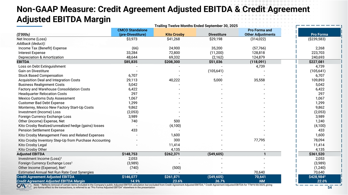 Non-GAAP Measures: Kito Crosby Credit Agreement Adjusted EBITDA and Credit Agreement Adjusted EBITDA Margin ($M) Kito FYE 12/31/2023 Kito FYE 12/31/2024 Kito TTM 9/30/2025 Net income (loss) ($18.2) $18.5 $41.3 Add back (deduct): Income tax expense (benefit) 7.3 26.1 24.9 Interest and debt expense 115.4 97.1 72.8 Realized/unrealized hedge (gains) losses (5.2) (5.7) (4.1) Depreciation and amortization expense 81.1 72.9 69.3 Transaction and integration costs 22.9 20.2 40.2 Acquisition inventory step-up expense 41.3 0.3 0.3 Debt extinguishment expense 5.0 16.0 — Non-recurring legal expenses 5.4 12.1 11.4 Other 4.0 4.1 (1.1) Management fees and related expenses 1.6 1.6 1.6 Credit Agreement Adjusted EBITDA $255.5 $263.1 $261.9 Net sales $1,111.1 $1,101.1 $1,110.7 Net margin (%) (1.6%) 1.7% 3.7% Credit Agreement Adjusted EBITDA Margin (%) 23.0% 23.9% 23.6% Note: May not add due to rounding 53