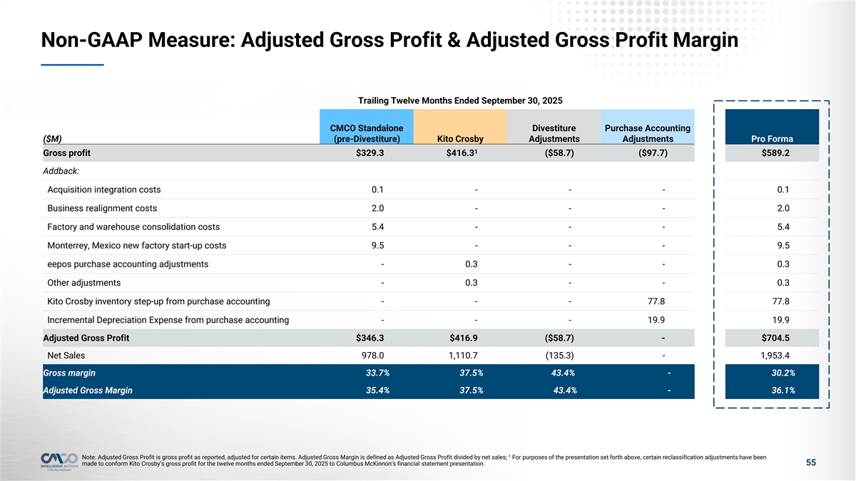 Non-GAAP Measure: Credit Agreement Adjusted EBITDA & Credit Agreement Adjusted EBITDA Margin Trailing Twelve Months Ended September 30, 2025 CMCO Standalone Pro Forma and ($’000s) (pre-Divestiture) Kito Crosby Divestiture Other Adjustments Pro Forma Net Income (Loss) $3,973 $41,268 $29,198 (314,022) ($239,583) Addback (deduct): Income Tax (Benefit) Expense (66) 24,900 35,200 (57,766) 2,268 Interest Expense 33,284 72,800 (11,200) 128,818 223,703 Depreciation & Amortization 48,644 69,332 (2,162) 124,879 240,693 EBITDA $85,835 $208,300 $51,036 (118,091) $227,081 Loss on Debt Extinguishment - - - 4,739 4,739 Gain on Divestiture - - (105,641) - (105,641) Stock Based Compensation 6,707 - - - 6,707 Acquisition Deal and Integration Costs 29,113 40,222 5,000 35,558 109,893 Business Realignment Costs 5,042 - - - 5,042 Factory and Warehouse Consolidation Costs 6,422 - - - 6,422 Headquarter Relocation Costs 297 - - - 297 Mexico Customs Duty Assessment 1,067 - - - 1,067 Customer Bad Debt Expense 1,299 - - - 1,299 Monterrey, Mexico New Factory Start-Up Costs 9,862 - - - 9,862 Investment (Income) Loss (2,053) - - - (2,053) Foreign Currency Exchange Loss 3,989 - - - 3,989 Other (income) Expense, Net 740 500 - - 1,240 Kito Crosby Realized/unrealized hedge (gains) losses - (4,100) - - (4,100) Pension Settlement Expense 433 - - - 433 Kito Crosby Management Fees and Related Expenses - 1,600 - - 1,600 - 300 - 77,795 78,094 Kito Crosby Inventory Step-Up from Purchase Accounting Kito Crosby Legal - 11,414 - - 11,414 Kito Crosby Other 4,135 - - 4,135 Adjusted EBITDA $148,753 $262,371 ($49,605) 1 $361,520 1 Investment Income (Loss) 2,053 - - - 2,053 1 Foreign Currency Exchange Loss (3,989) - - - (3,989) 1 Other Income (Expense), Net (740) (500) - - (1,240) Estimated Annual Net Run Rate Cost Synergies - - - 70,640 70,640 2 Credit Agreement Adjusted EBITDA $146,077 $261,871 ($49,605) 70,641 $428,984 Credit Agreement Adjusted EBITDA Margin 14.9% 23.6% 36.7% NM 22.0% 1 2 Note: Reflects removal of certain items included in the Company's public Adjusted EBITDA calculation but excluded from Credit Agreement Adjusted EBITDA; Credit Agreement Adjusted EBITDA for TTM 9/30/2025, giving pro forma effect to the transactions, is referred to as “Pro Forma Adjusted EBITDA” elsewhere in the presentation 54