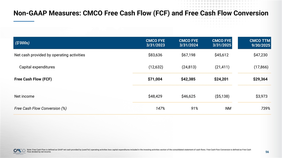 Non-GAAP Measures: CMCO Free Cash Flow (FCF) and Free Cash Flow Conversion CMCO FYE CMCO FYE CMCO FYE CMCO TTM ($’000s) 3/31/2023 3/31/2024 3/31/2025 9/30/2025 Net cash provided by operating activities $83,636 $67,198 $45,612 $47,230 Capital expenditures (12,632) (24,813) (21,411) (17,866) Free Cash Flow (FCF) $71,004 $42,385 $24,201 $29,364 Net income $48,429 $46,625 ($5,138) $3,973 Free Cash Flow Conversion (%) 147% 91% NM 739% Note: Free Cash Flow is defined as GAAP net cash provided by (used for) operating activities less capital expenditures included in the investing activities section of the consolidated statement of cash flows. Free Cash Flow Conversion is defined as Free Cash Flow divided by net income. 56