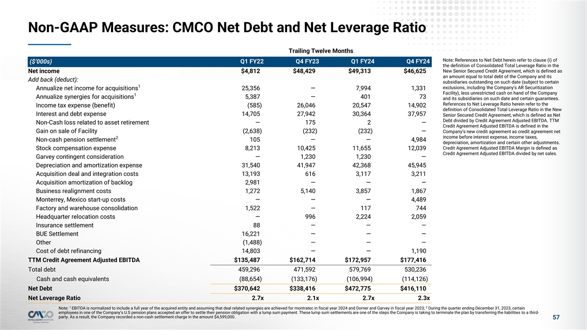 Non-GAAP Measures: CMCO Net Debt and Net Leverage Ratio Trailing Twelve Months Note: References to Net Debt herein refer to clause (i) of ($’000s) Q1 FY22 Q4 FY23 Q1 FY24 Q4 FY24 the definition of Consolidated Total Leverage Ratio in the New Senior Secured Credit Agreement, which is defined as Net income $4,812 $48,429 $49,313 $46,625 an amount equal to total debt of the Company and its Add back (deduct): subsidiaries outstanding on such date (subject to certain 1 exclusions, including the Company's AR Securitization Annualize net income for acquisitions 25,356 — 7,994 1,331 Facility), less unrestricted cash on hand of the Company 1 Annualize synergies for acquisitions 5,387 — 401 73 and its subsidiaries on such date and certain guarantees. References to Net Leverage Ratio herein refer to the Income tax expense (benefit) (585) 26,046 20,547 14,902 definition of Consolidated Total Leverage Ratio in the New Interest and debt expense 14,705 27,942 30,364 37,957 Senior Secured Credit Agreement, which is defined as Net Debt divided by Credit Agreement Adjusted EBITDA. TTM Non-Cash loss related to asset retirement — 175 2 — Credit Agreement Adjusted EBITDA is defined in the Gain on sale of Facility (2,638) (232) (232) — Company’s new credit agreement as credit agreement net income before interest expense, income taxes, 2 Non-cash pension settlement 105 — — 4,984 depreciation, amortization and certain other adjustments. Credit Agreement Adjusted EBITDA Margin is defined as Stock compensation expense 8,213 10,425 11,655 12,039 Credit Agreement Adjusted EBITDA divided by net sales. Garvey contingent consideration — 1,230 1,230 — Depreciation and amortization expense 31,540 41,947 42,368 45,945 Acquisition deal and integration costs 13,193 616 3,117 3,211 Acquisition amortization of backlog 2,981 — — — Business realignment costs 1,272 5,140 3,857 1,867 Monterrey, Mexico start-up costs — — — 4,489 Factory and warehouse consolidation 1,522 — 117 744 Headquarter relocation costs — 996 2,224 2,059 Insurance settlement 88 — — — BUE Settlement 16,221 — — — Other (1,488) — — — Cost of debt refinancing 14,803 — — 1,190 TTM Credit Agreement Adjusted EBITDA $135,487 $162,714 $172,957 $177,416 Total debt 459,296 471,592 579,769 530,236 Cash and cash equivalents (88,654) (133,176) (106,994) (114,126) Net Debt $370,642 $338,416 $472,775 $416,110 Net Leverage Ratio 2.7x 2.1x 2.7x 2.3x 1 2 Note: EBITDA is normalized to include a full year of the acquired entity and assuming that deal related synergies are achieved for montratec in fiscal year 2024 and Dorner and Garvey in fiscal year 2023; During the quarter ending December 31, 2023, certain employees in one of the Company’s U.S pension plans accepted an offer to settle their pension obligation with a lump sum payment. These lump sum settlements are one of the steps the Company is taking to terminate the plan by transferring the liabilities to a third- party. As a result, the Company recorded a non-cash settlement charge in the amount $4,599,000. 57