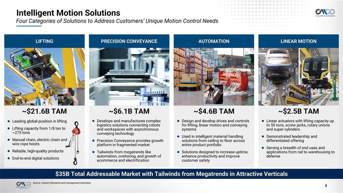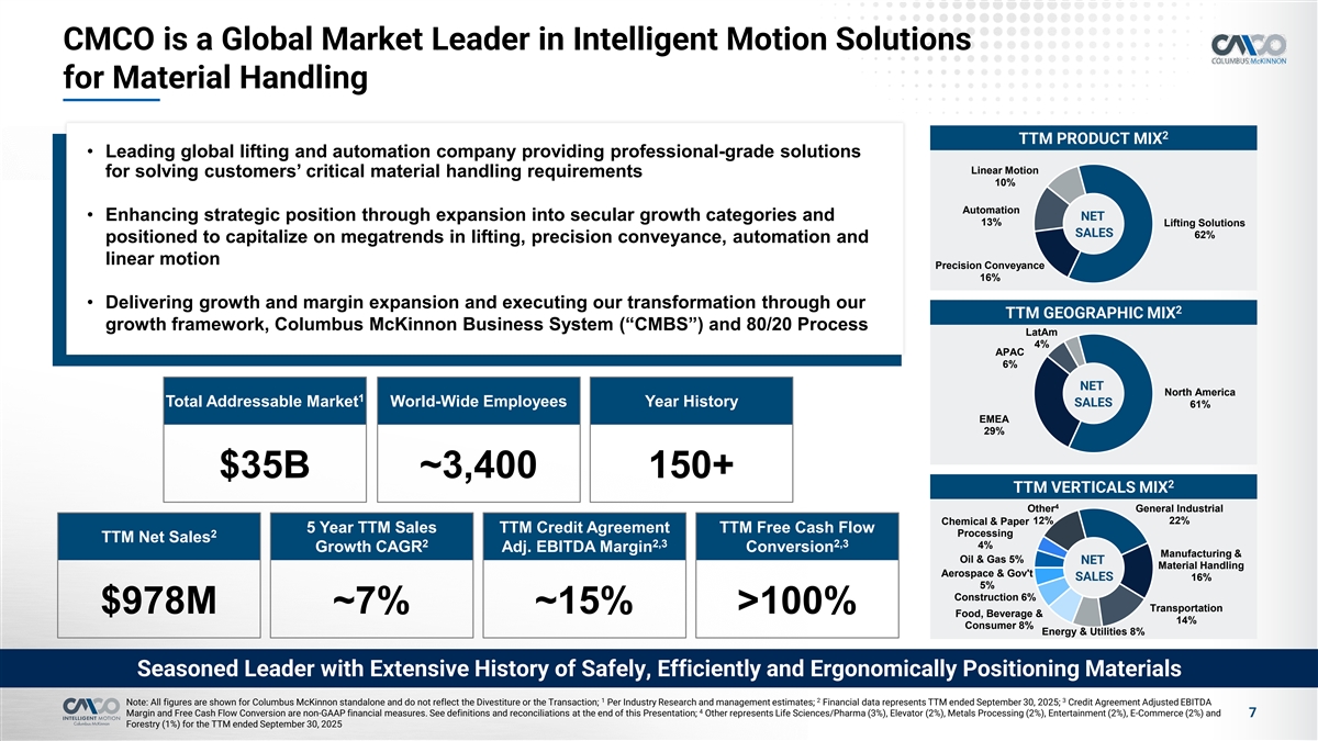 CMCO is a Global Market Leader in Intelligent Motion Solutions for Material Handling 2 TTM PRODUCT MIX • Leading global lifting and automation company providing professional-grade solutions Linear Motion for solving customers’ critical material handling requirements 10% Automation • Enhancing strategic position through expansion into secular growth categories and NET 13% Lifting Solutions SALES 62% positioned to capitalize on megatrends in lifting, precision conveyance, automation and linear motion Precision Conveyance 16% • Delivering growth and margin expansion and executing our transformation through our 2 TTM GEOGRAPHIC MIX growth framework, Columbus McKinnon Business System (“CMBS”) and 80/20 Process LatAm 4% APAC 6% NET 1 North America 1 Total Addressable Market Total Addressable Market World-Wide Employees Year History SALES 61% EMEA 29% $35B ~3,400 150+ 2 TTM VERTICALS MIX 4 Other General Industrial 12% 22% Chemical & Paper 5 Year TTM Sales TTM Credit Agreement TTM Free Cash Flow Processing 2 TTM Net Sales 2 2,3 2,3 4% Growth CAGR Adj. EBITDA Margin Conversion Manufacturing & Oil & Gas 5% NET Material Handling Aerospace & Gov't SALES 16% 5% Construction 6% Transportation $978M ~7% ~15% >100% Food, Beverage & 14% Consumer 8% Energy & Utilities 8% Seasoned Leader with Extensive History of Safely, Efficiently and Ergonomically Positioning Materials 1 2 3 Note: All figures are shown for Columbus McKinnon standalone and do not reflect the Divestiture or the Transaction; Per Industry Research and management estimates; Financial data represents TTM ended September 30, 2025; Credit Agreement Adjusted EBITDA 4 Margin and Free Cash Flow Conversion are non-GAAP financial measures. See definitions and reconciliations at the end of this Presentation; Other represents Life Sciences/Pharma (3%), Elevator (2%), Metals Processing (2%), Entertainment (2%), E-Commerce (2%) and 7 Forestry (1%) for the TTM ended September 30, 2025