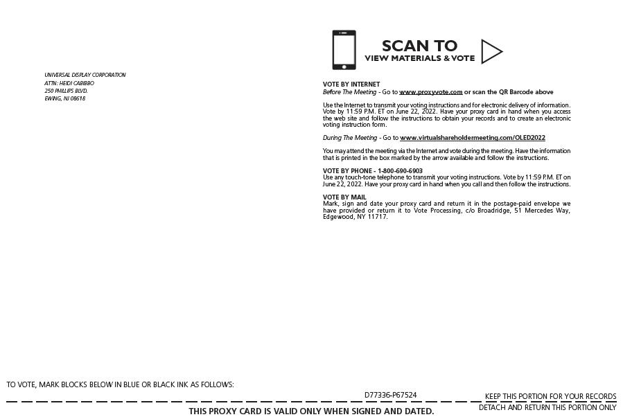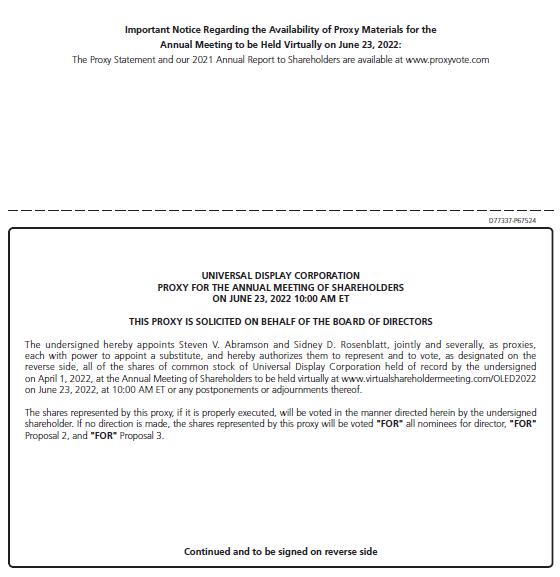 Important Notice Regarding the Availability of Proxy Materials for the Annual Meeting to be Held Virtually on June 23, 2022: The Proxy Statement and our 2021 Annual Report to Shareholders are available at www.proxyvote.com D77337-P67524 UNIVERSAL DISPLAY CORPORATION PROXY FOR THE ANNUAL MEETING OF SHAREHOLDERS ON JUNE 23, 2022 10:00 AM ET THIS PROXY IS SOLICITED ON BEHALF OF THE BOARD OF DIRECTORS The undersigned hereby appoints Steven V. Abramson and Sidney D. Rosenblatt, jointly and severally, as proxies, each with power to appoint a substitute, and hereby authorizes them to represent and to vote, as designated on the reverse side, all of the shares of common stock of Universal Display Corporation held of record by the undersigned on April 1, 2022, at the Annual Meeting of Shareholders to be held virtually at www.virtualshareholdermeeting.com/OLED2022 on June 23, 2022, at 10:00 AM ET or any postponements or adjournments thereof. The shares represented by this proxy, if it is properly executed, will be voted in the manner directed herein by the undersigned shareholder. If no direction is made, the shares represented by this proxy will be voted "FOR" all nominees for director, "FOR" Proposal 2, and "FOR" Proposal 3. Continued and to be signed on reverse side