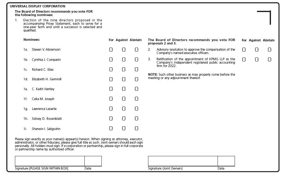 SCAN TO VIEW MATERIALS & VOTE UNIVERSAL DISPLAY CORPORATION ATTN: HEIDI CABIBBO 250 PHILLIPS BLVD. EWING, NJ 08618 VOTE BY INTERNET Before The Meeting - Go to www.proxyvote.com or scan the QR Barcode above Use the Internet to transmit your voting instructions and for electronic delivery of information. Vote by 11:59 P.M. ET on June 22, 2022. Have your proxy card in hand when you access the web site and follow the instructions to obtain your records and to create an electronic voting instruction form. During The Meeting - Go to www.virtualshareholdermeeting.com/OLED2022 You may attend the meeting via the Internet and vote during the meeting. Have the information that is printed in the box marked by the arrow available and follow the instructions. VOTE BY PHONE - 1-800-690-6903 Use any touch-tone telephone to transmit your voting instructions. Vote by 11:59 P.M. ET on June 22, 2022. Have your proxy card in hand when you call and then follow the instructions. VOTE BY MAIL Mark, sign and date your proxy card and return it in the postage-paid envelope we have provided or return it to Vote Processing, c/o Broadridge, 51 Mercedes Way, Edgewood, NY 11717. D77336-P67524 UNIVERSAL DISPLAY CORPORATION The Board of Directors recommends you vote FOR the following nominees: 1. Election of the nine directors proposed in the accompanying Proxy Statement, each to serve for a one-year term and until a successor is selected and qualified. Nominees: Against Abstain For The Board of Directors recommends you vote FOR proposals 2 and 3. For Against Abstain ! ! ! ! ! ! 2. Advisory resolution to approve the compensation of the Company's named executive officers. 1a. Steven V. Abramson ! ! ! ! ! ! 3. Ratification of the appointment of KPMG LLP as the Company's independent registered public accounting firm for 2022. 1b. Cynthia J. Comparin ! ! ! 1c. Richard C. Elias NOTE: Such other business as may properly come before the meeting or any adjournment thereof. ! ! ! 1d. Elizabeth H. Gemmill ! ! ! 1e. C. Keith Hartley ! ! ! 1f. Celia M. Joseph ! ! ! 1g. Lawrence Lacerte ! ! ! 1h. Sidney D. Rosenblatt ! ! ! 1i. Sherwin I. Seligsohn Please sign exactly as your name(s) appear(s) hereon. When signing as attorney, executor, administrator, or other fiduciary, please give full title as such. Joint owners should each sign personally. All holders must sign. If a corporation or partnership, please sign in full corporate or partnership name by authorized officer.