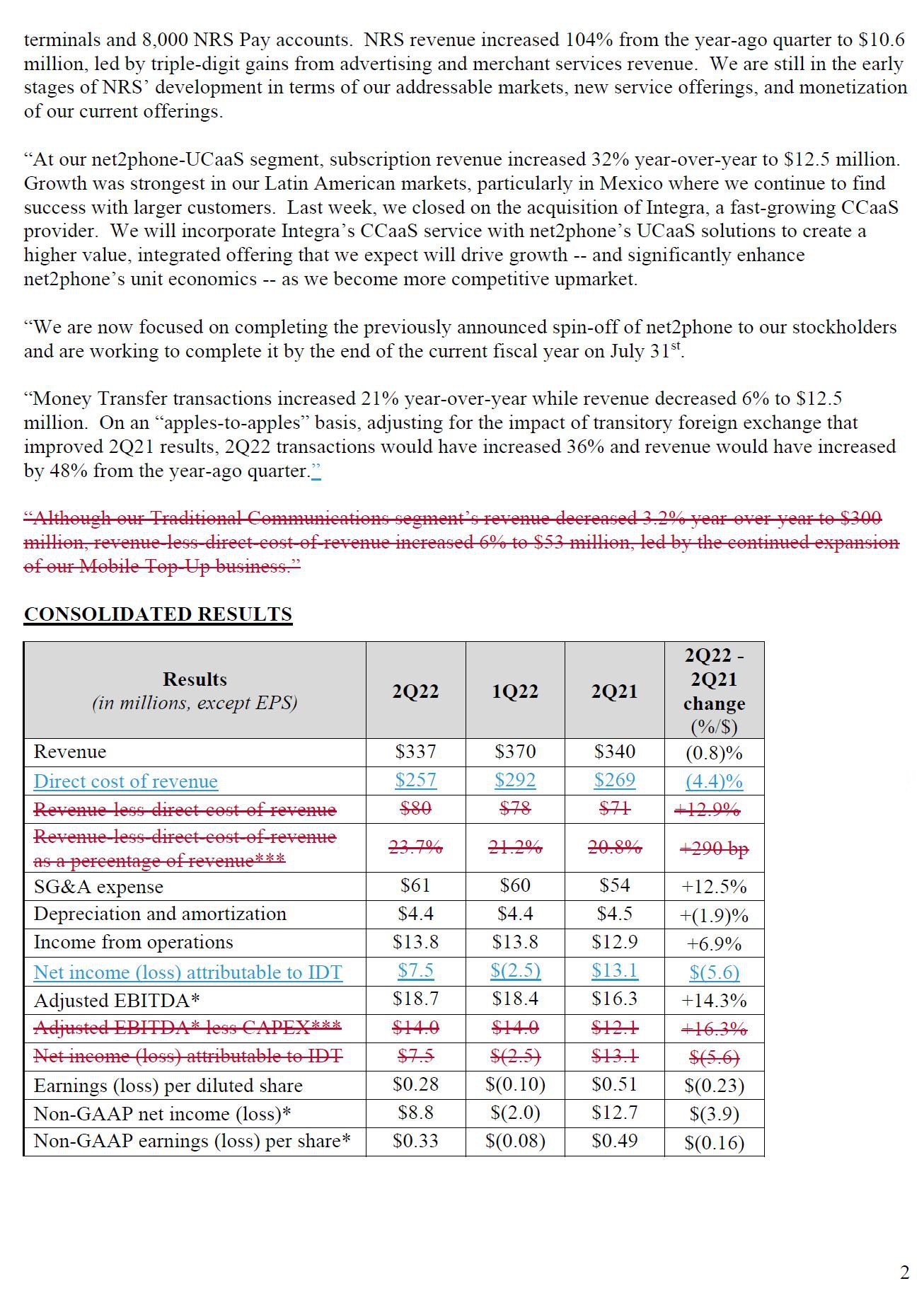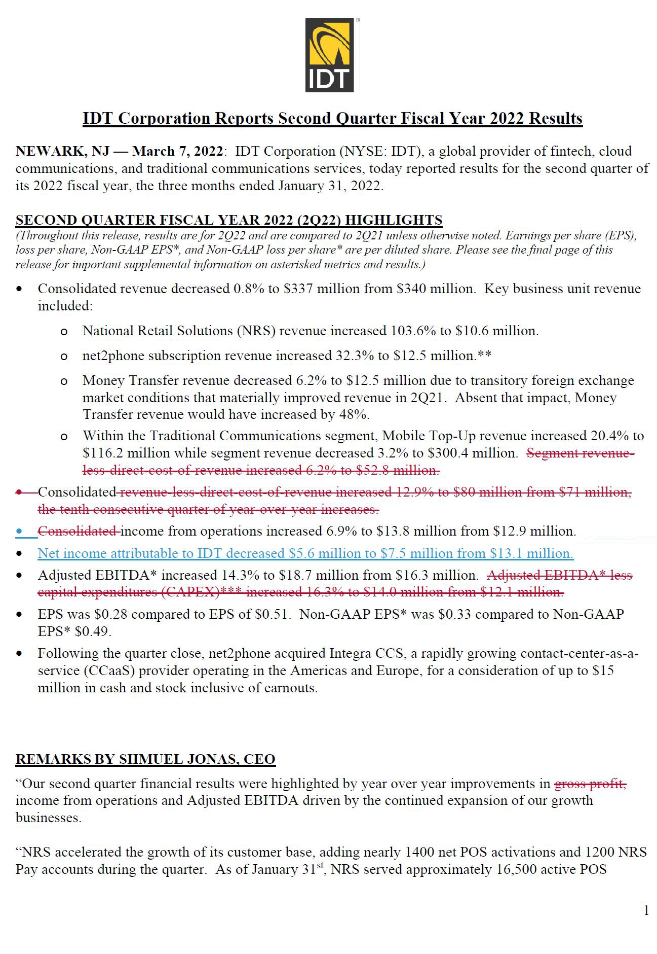 | 3. | When disclosing Adjusted EBITDA, please revise to disclose the corresponding GAAP measure with equal or greater prominence. In this regard we note that you present Adjusted EBITDA in the highlighted bullet points but do not disclose the comparable GAAP measure of net (loss) income attributable to IDT. Similarly, you present Adjusted EBITDA prior to GAAP net (loss) income attributable to IDT in the tabular presentation of Consolidated Results. Also, the starting point for your reconciliations of Adjusted EBITDA should be the most directly comparable GAAP measure, which you disclose is net (loss) income attributable to IDT on a consolidated basis and income (loss) from operations for the reportable segments. Please revise and in your response provide us with the disclosures you intend to include in future filings. Refer to Item 10(e)(1)(i) of Regulation S-K and Question 102.10 of the Non-GAAP C&DIs. | |