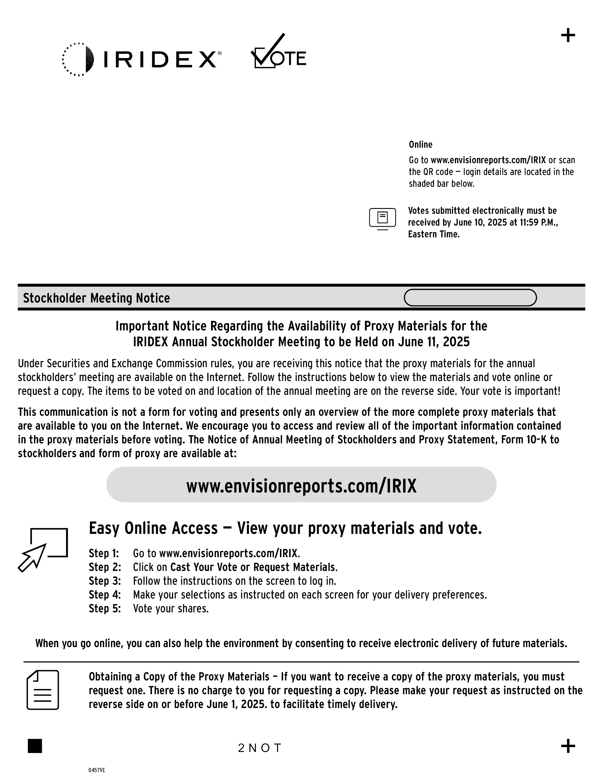Online Go to www.envisionreports.com/IRIX or scan the QR code — login details are located in the shaded bar below. Votes submitted electronically must be received by June 10, 2025 at 11:59 P.M., Eastern Time. Stockholder Meeting Notice Important Notice Regarding the Availability of Proxy Materials for the IRIDEX Annual Stockholder Meeting to be Held on June 11, 2025 Under Securities and Exchange Commission rules, you are receiving this notice that the proxy materials for the annual stockholders’ meeting are available on the Internet. Follow the instructions below to view the materials and vote online or request a copy. The items to be voted on and location of the annual meeting are on the reverse side. Your vote is important! This communication is not a form for voting and presents only an overview of the more complete proxy materials that are available to you on the Internet. We encourage you to access and review all of the important information contained in the proxy materials before voting. The Notice of Annual Meeting of Stockholders and Proxy Statement, Form 10-K to stockholders and form of proxy are available at: www.envisionreports.com/IRIX Easy Online Access — View your proxy materials and vote. Step 1: Go to www.envisionreports.com/IRIX.Step 2: Click on Cast Your Vote or Request Materials. Step 3: Follow the instructions on the screen to log in. Step 4: Make your selections as instructed on each screen for your delivery preferences. Step 5: Vote your shares. When you go online, you can also help the environment by consenting to receive electronic delivery of future materials. Obtaining a Copy of the Proxy Materials – If you want to receive a copy of the proxy materials, you must request one. There is no charge to you for requesting a copy. Please make your request as instructed on the reverse side on or before June 1, 2025. to facilitate timely delivery. 2NOT 0457VE