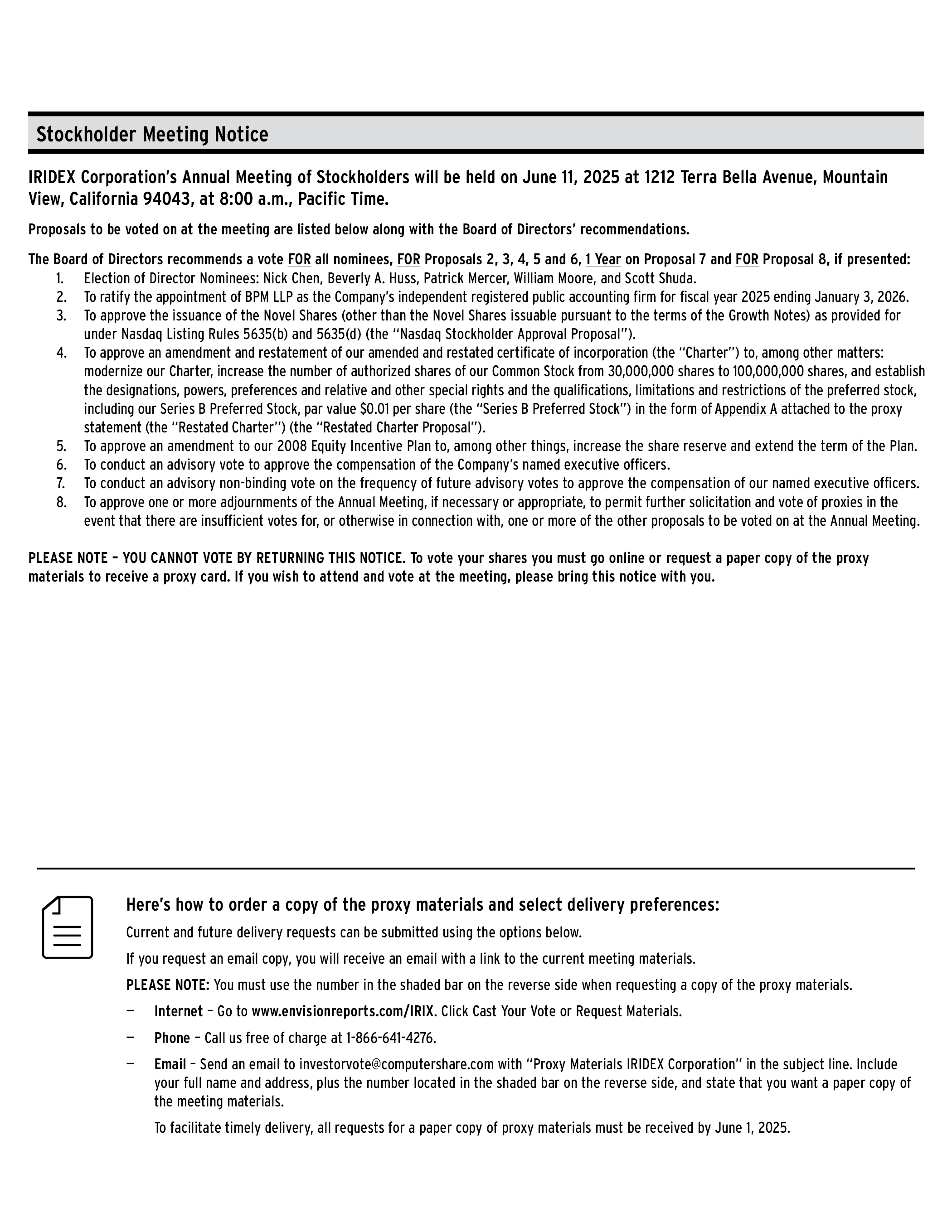 Stockholder Meeting Notice IRIDEX Corporation’s Annual Meeting of Stockholders will be held on June 11, 2025 at 1212 Terra Bella Avenue, Mountain View, California 94043, at 8:00 a.m., Pacific Time. Proposals to be voted on at the meeting are listed below along with the Board of Directors’ recommendations. The Board of Directors recommends a vote FOR all nominees, FOR Proposals 2, 3, 4, 5 and 6, 1 Year on Proposal 7 and FOR Proposal 8, if presented: 1.Election of Director Nominees: Nick Chen, Beverly A. Huss, Patrick Mercer, William Moore, and Scott Shuda. 2. To ratify the appointment of BPM LLP as the Company’s independent registered public accounting firm for fiscal year 2025 ending January 3, 2026. 3. To approve the issuance of the Novel Shares (other than the Novel Shares issuable pursuant to the terms of the Growth Notes) as provided for under Nasdaq Listing Rules 5635(b) and 5635(d) (the “Nasdaq Stockholder Approval Proposal”). 4. To approve an amendment and restatement of our amended and restated certificate of incorporation (the “Charter”) to, among other matters: modernize our Charter, increase the number of authorized shares of our Common Stock from 30,000,000 shares to 100,000,000 shares, and establish the designations, powers, preferences and relative and other special rights and the qualifications, limitations and restrictions of the preferred stock, including our Series B Preferred Stock, par value $0.01 per share (the “Series B Preferred Stock”) in the form of Appendix A attached to the proxy statement (the “Restated Charter”) (the “Restated Charter Proposal”). 5. To approve an amendment to our 2008 Equity Incentive Plan to, among other things, increase the share reserve and extend the term of the Plan. 6.To conduct an advisory vote to approve the compensation of the Company’s named executive officers. 7.To conduct an advisory non-binding vote on the frequency of future advisory votes to approve the compensation of our named executive officers. 8. To approve one or more adjournments of the Annual Meeting, if necessary or appropriate, to permit further solicitation and vote of proxies in the event that there are insufficient votes for, or otherwise in connection with, one or more of the other proposals to be voted on at the Annual Meeting. PLEASE NOTE –YOU CANNOT VOTE BY RETURNING THIS NOTICE. To vote your shares you must go online or request a paper copy of the proxy materials to receive a proxy card. If you wish to attend and vote at the meeting, please bring this notice with you.
