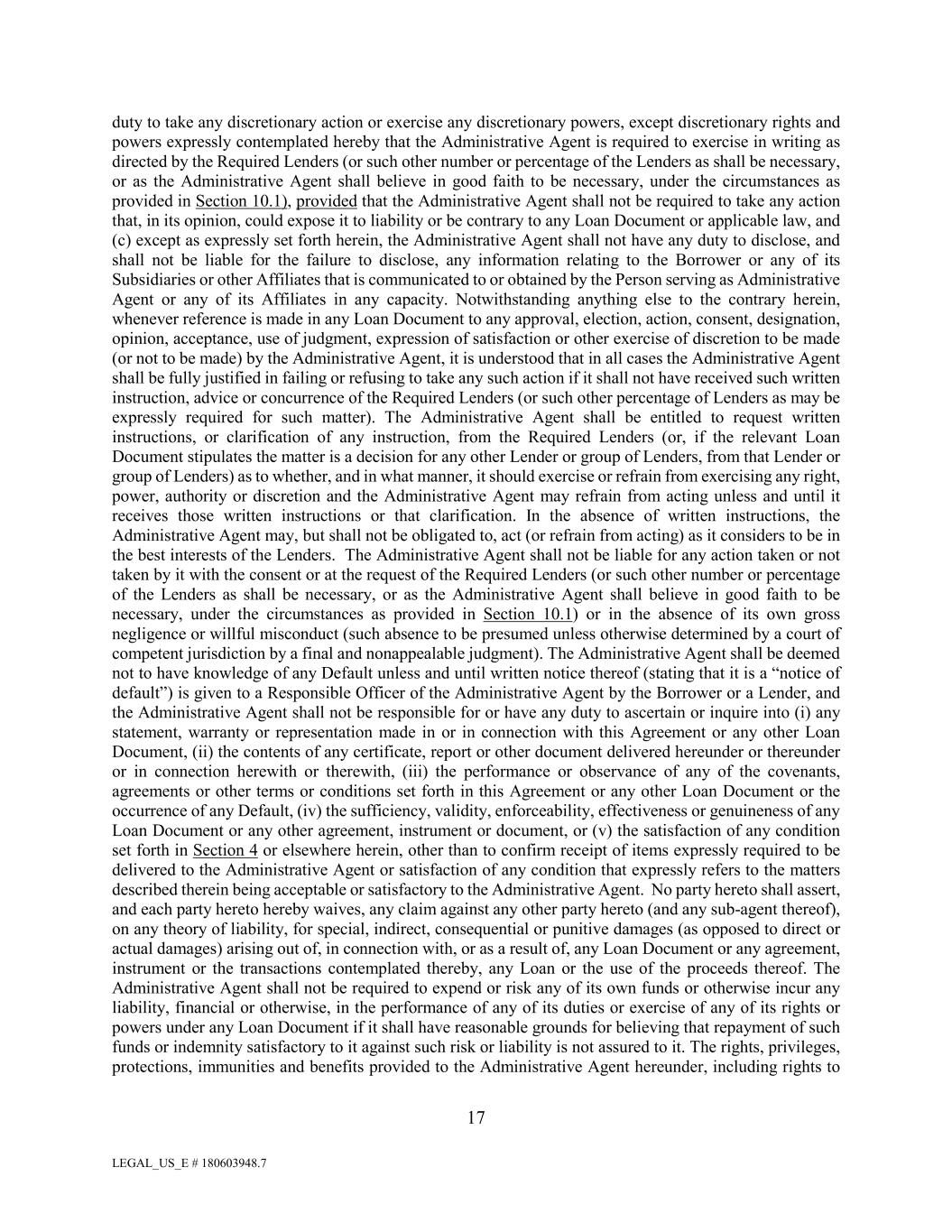 LEGAL_US_E # 180603948.7 17 duty to take any discretionary action or exercise any discretionary powers, except discretionary rights and powers expressly contemplated hereby that the Administrative Agent is required to exercise in writing as directed by the Required Lenders (or such other number or percentage of the Lenders as shall be necessary, or as the Administrative Agent shall believe in good faith to be necessary, under the circumstances as provided in Section 10.1), provided that the Administrative Agent shall not be required to take any action that, in its opinion, could expose it to liability or be contrary to any Loan Document or applicable law, and (c) except as expressly set forth herein, the Administrative Agent shall not have any duty to disclose, and shall not be liable for the failure to disclose, any information relating to the Borrower or any of its Subsidiaries or other Affiliates that is communicated to or obtained by the Person serving as Administrative Agent or any of its Affiliates in any capacity. Notwithstanding anything else to the contrary herein, whenever reference is made in any Loan Document to any approval, election, action, consent, designation, opinion, acceptance, use of judgment, expression of satisfaction or other exercise of discretion to be made (or not to be made) by the Administrative Agent, it is understood that in all cases the Administrative Agent shall be fully justified in failing or refusing to take any such action if it shall not have received such written instruction, advice or concurrence of the Required Lenders (or such other percentage of Lenders as may be expressly required for such matter). The Administrative Agent shall be entitled to request written instructions, or clarification of any instruction, from the Required Lenders (or, if the relevant Loan Document stipulates the matter is a decision for any other Lender or group of Lenders, from that Lender or group of Lenders) as to whether, and in what manner, it should exercise or refrain from exercising any right, power, authority or discretion and the Administrative Agent may refrain from acting unless and until it receives those written instructions or that clarification. In the absence of written instructions, the Administrative Agent may, but shall not be obligated to, act (or refrain from acting) as it considers to be in the best interests of the Lenders. The Administrative Agent shall not be liable for any action taken or not taken by it with the consent or at the request of the Required Lenders (or such other number or percentage of the Lenders as shall be necessary, or as the Administrative Agent shall believe in good faith to be necessary, under the circumstances as provided in Section 10.1) or in the absence of its own gross negligence or willful misconduct (such absence to be presumed unless otherwise determined by a court of competent jurisdiction by a final and nonappealable judgment). The Administrative Agent shall be deemed not to have knowledge of any Default unless and until written notice thereof (stating that it is a “notice of default”) is given to a Responsible Officer of the Administrative Agent by the Borrower or a Lender, and the Administrative Agent shall not be responsible for or have any duty to ascertain or inquire into (i) any statement, warranty or representation made in or in connection with this Agreement or any other Loan Document, (ii) the contents of any certificate, report or other document delivered hereunder or thereunder or in connection herewith or therewith, (iii) the performance or observance of any of the covenants, agreements or other terms or conditions set forth in this Agreement or any other Loan Document or the occurrence of any Default, (iv) the sufficiency, validity, enforceability, effectiveness or genuineness of any Loan Document or any other agreement, instrument or document, or (v) the satisfaction of any condition set forth in Section 4 or elsewhere herein, other than to confirm receipt of items expressly required to be delivered to the Administrative Agent or satisfaction of any condition that expressly refers to the matters described therein being acceptable or satisfactory to the Administrative Agent. No party hereto shall assert, and each party hereto hereby waives, any claim against any other party hereto (and any sub-agent thereof), on any theory of liability, for special, indirect, consequential or punitive damages (as opposed to direct or actual damages) arising out of, in connection with, or as a result of, any Loan Document or any agreement, instrument or the transactions contemplated thereby, any Loan or the use of the proceeds thereof. The Administrative Agent shall not be required to expend or risk any of its own funds or otherwise incur any liability, financial or otherwise, in the performance of any of its duties or exercise of any of its rights or powers under any Loan Document if it shall have reasonable grounds for believing that repayment of such funds or indemnity satisfactory to it against such risk or liability is not assured to it. The rights, privileges, protections, immunities and benefits provided to the Administrative Agent hereunder, including rights to
