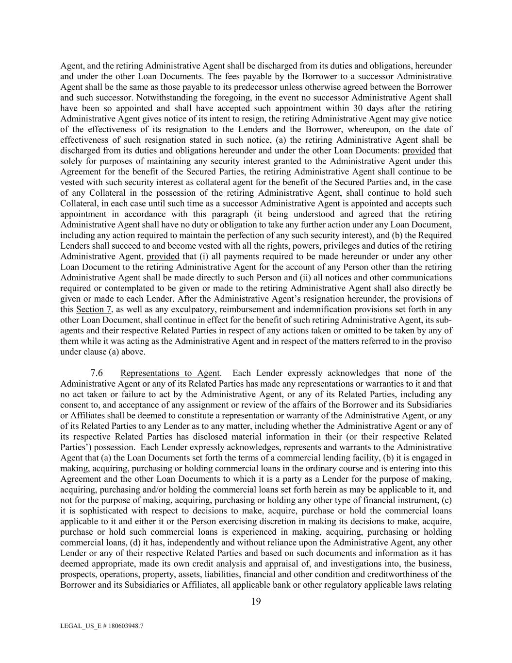 LEGAL_US_E # 180603948.7 19 Agent, and the retiring Administrative Agent shall be discharged from its duties and obligations, hereunder and under the other Loan Documents. The fees payable by the Borrower to a successor Administrative Agent shall be the same as those payable to its predecessor unless otherwise agreed between the Borrower and such successor. Notwithstanding the foregoing, in the event no successor Administrative Agent shall have been so appointed and shall have accepted such appointment within 30 days after the retiring Administrative Agent gives notice of its intent to resign, the retiring Administrative Agent may give notice of the effectiveness of its resignation to the Lenders and the Borrower, whereupon, on the date of effectiveness of such resignation stated in such notice, (a) the retiring Administrative Agent shall be discharged from its duties and obligations hereunder and under the other Loan Documents: provided that solely for purposes of maintaining any security interest granted to the Administrative Agent under this Agreement for the benefit of the Secured Parties, the retiring Administrative Agent shall continue to be vested with such security interest as collateral agent for the benefit of the Secured Parties and, in the case of any Collateral in the possession of the retiring Administrative Agent, shall continue to hold such Collateral, in each case until such time as a successor Administrative Agent is appointed and accepts such appointment in accordance with this paragraph (it being understood and agreed that the retiring Administrative Agent shall have no duty or obligation to take any further action under any Loan Document, including any action required to maintain the perfection of any such security interest), and (b) the Required Lenders shall succeed to and become vested with all the rights, powers, privileges and duties of the retiring Administrative Agent, provided that (i) all payments required to be made hereunder or under any other Loan Document to the retiring Administrative Agent for the account of any Person other than the retiring Administrative Agent shall be made directly to such Person and (ii) all notices and other communications required or contemplated to be given or made to the retiring Administrative Agent shall also directly be given or made to each Lender. After the Administrative Agent’s resignation hereunder, the provisions of this Section 7, as well as any exculpatory, reimbursement and indemnification provisions set forth in any other Loan Document, shall continue in effect for the benefit of such retiring Administrative Agent, its sub- agents and their respective Related Parties in respect of any actions taken or omitted to be taken by any of them while it was acting as the Administrative Agent and in respect of the matters referred to in the proviso under clause (a) above. 7.6 Representations to Agent. Each Lender expressly acknowledges that none of the Administrative Agent or any of its Related Parties has made any representations or warranties to it and that no act taken or failure to act by the Administrative Agent, or any of its Related Parties, including any consent to, and acceptance of any assignment or review of the affairs of the Borrower and its Subsidiaries or Affiliates shall be deemed to constitute a representation or warranty of the Administrative Agent, or any of its Related Parties to any Lender as to any matter, including whether the Administrative Agent or any of its respective Related Parties has disclosed material information in their (or their respective Related Parties’) possession. Each Lender expressly acknowledges, represents and warrants to the Administrative Agent that (a) the Loan Documents set forth the terms of a commercial lending facility, (b) it is engaged in making, acquiring, purchasing or holding commercial loans in the ordinary course and is entering into this Agreement and the other Loan Documents to which it is a party as a Lender for the purpose of making, acquiring, purchasing and/or holding the commercial loans set forth herein as may be applicable to it, and not for the purpose of making, acquiring, purchasing or holding any other type of financial instrument, (c) it is sophisticated with respect to decisions to make, acquire, purchase or hold the commercial loans applicable to it and either it or the Person exercising discretion in making its decisions to make, acquire, purchase or hold such commercial loans is experienced in making, acquiring, purchasing or holding commercial loans, (d) it has, independently and without reliance upon the Administrative Agent, any other Lender or any of their respective Related Parties and based on such documents and information as it has deemed appropriate, made its own credit analysis and appraisal of, and investigations into, the business, prospects, operations, property, assets, liabilities, financial and other condition and creditworthiness of the Borrower and its Subsidiaries or Affiliates, all applicable bank or other regulatory applicable laws relating
