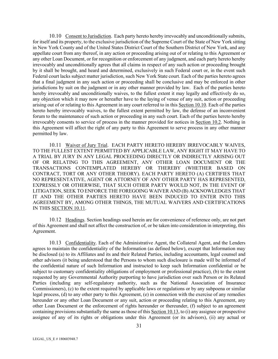 LEGAL_US_E # 180603948.7 31 10.10 Consent to Jurisdiction. Each party hereto hereby irrevocably and unconditionally submits, for itself and its property, to the exclusive jurisdiction of the Supreme Court of the State of New York sitting in New York County and of the United States District Court of the Southern District of New York, and any appellate court from any thereof, in any action or proceeding arising out of or relating to this Agreement or any other Loan Document, or for recognition or enforcement of any judgment, and each party hereto hereby irrevocably and unconditionally agrees that all claims in respect of any such action or proceeding brought by it shall be brought, and heard and determined, exclusively in such Federal court or, in the event such Federal court lacks subject matter jurisdiction, such New York State court. Each of the parties hereto agrees that a final judgment in any such action or proceeding shall be conclusive and may be enforced in other jurisdictions by suit on the judgment or in any other manner provided by law. Each of the parties hereto hereby irrevocably and unconditionally waives, to the fullest extent it may legally and effectively do so, any objection which it may now or hereafter have to the laying of venue of any suit, action or proceeding arising out of or relating to this Agreement in any court referred to in this Section 10.10. Each of the parties hereto hereby irrevocably waives, to the fullest extent permitted by law, the defense of an inconvenient forum to the maintenance of such action or proceeding in any such court. Each of the parties hereto hereby irrevocably consents to service of process in the manner provided for notices in Section 10.2. Nothing in this Agreement will affect the right of any party to this Agreement to serve process in any other manner permitted by law. 10.11 Waiver of Jury Trial. EACH PARTY HERETO HEREBY IRREVOCABLY WAIVES, TO THE FULLEST EXTENT PERMITTED BY APPLICABLE LAW, ANY RIGHT IT MAY HAVE TO A TRIAL BY JURY IN ANY LEGAL PROCEEDING DIRECTLY OR INDIRECTLY ARISING OUT OF OR RELATING TO THIS AGREEMENT, ANY OTHER LOAN DOCUMENT OR THE TRANSACTIONS CONTEMPLATED HEREBY OR THEREBY (WHETHER BASED ON CONTRACT, TORT OR ANY OTHER THEORY). EACH PARTY HERETO (A) CERTIFIES THAT NO REPRESENTATIVE, AGENT OR ATTORNEY OF ANY OTHER PARTY HAS REPRESENTED, EXPRESSLY OR OTHERWISE, THAT SUCH OTHER PARTY WOULD NOT, IN THE EVENT OF LITIGATION, SEEK TO ENFORCE THE FOREGOING WAIVER AND (B) ACKNOWLEDGES THAT IT AND THE OTHER PARTIES HERETO HAVE BEEN INDUCED TO ENTER INTO THIS AGREEMENT BY, AMONG OTHER THINGS, THE MUTUAL WAIVERS AND CERTIFICATIONS IN THIS SECTION 10.11. 10.12 Headings. Section headings used herein are for convenience of reference only, are not part of this Agreement and shall not affect the construction of, or be taken into consideration in interpreting, this Agreement. 10.13 Confidentiality. Each of the Administrative Agent, the Collateral Agent, and the Lenders agrees to maintain the confidentiality of the Information (as defined below), except that Information may be disclosed (a) to its Affiliates and its and their Related Parties, including accountants, legal counsel and other advisors (it being understood that the Persons to whom such disclosure is made will be informed of the confidential nature of such Information and instructed to keep such Information confidential or be subject to customary confidentiality obligations of employment or professional practice), (b) to the extent requested by any Governmental Authority purporting to have jurisdiction over such Person or its Related Parties (including any self-regulatory authority, such as the National Association of Insurance Commissioners), (c) to the extent required by applicable laws or regulations or by any subpoena or similar legal process, (d) to any other party to this Agreement, (e) in connection with the exercise of any remedies hereunder or any other Loan Document or any suit, action or proceeding relating to this Agreement, any other Loan Document or the enforcement of rights hereunder or thereunder, (f) subject to an agreement containing provisions substantially the same as those of this Section 10.13, to (i) any assignee or prospective assignee of any of its rights or obligations under this Agreement (or its advisors), (ii) any actual or