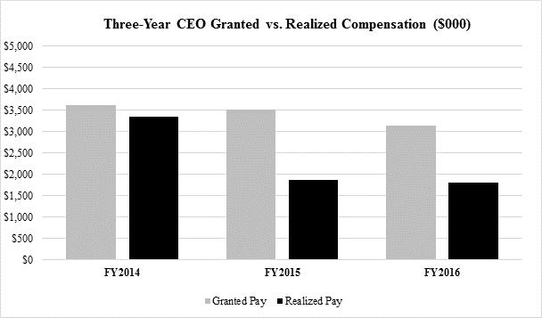 stockholder value with those of stockholders. The program seeks to align executive compensation with stockholder value on an annual and long-term basis through a combination of base pay, annual cash incentives, and equity and cash long-term incentives. The annual cash component was based upon achievement under a mix of Company performance measures. In addition, long-term incentive awards are comprised of restricted stock awards and long-term cash awards based on specified measures of Company performance over a three-year period. The Company also has programs in place to align executive compensation with stockholder interests and mitigate risks in its plans, such as stock retention guidelines and limited perquisites.
