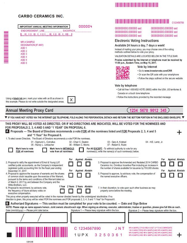 . CARBO CERAMICS INC. MMMMMMMMMMMM MMMMMMMMMMMMMMM C123456789 IMPORTANT ANNUAL MEETING INFORMATION 000004 000000000.000000 ext 000000000.000000 ext ENDORSEMENT_LINE______________ SACKPACK_____________ 000000000.000000 ext 000000000.000000 ext 000000000.000000 ext 000000000.000000 ext MR A SAMPLE DESIGNATION (IF ANY) ADD 1 ADD 2 ADD 3 ADD 4 ADD 5 ADD 6 Using a black ink pen, mark your votes with an X as shown in this example. Please do not write outside the designated areas. Electronic Voting Instructions Available 24 hours a day, 7 days a week! Instead of mailing your proxy, you may choose one of the voting methods outlined below to vote your proxy. VALIDATION DETAILS ARE LOCATED BELOW IN THE TITLE BAR. Proxies submitted by the Internet or telephone must be received by 11:59 p.m., Eastern Time, on May 15, 2017. Vote by Internet • Go to www.investorvote.com/CRR • Or scan the QR code with your smartphone • Follow the steps outlined on the secure website Vote by telephone • Call toll free 1-800-652-VOTE (8683) within the USA, US territories & Canada on a touch tone telephone • Follow the instructions provided by the recorded message Annual Meeting Proxy Card 1234 5678 9012 345 q IF YOU HAVE NOT VOTED VIA THE INTERNET OR TELEPHONE, FOLD ALONG THE PERFORATION, DETACH AND RETURN THE BOTTOM PORTION IN THE ENCLOSED ENVELOPE. q THIS PROXY WILL BE VOTED AS DIRECTED, OR IF NO DIRECTIONS ARE INDICATED, WILL BE VOTED FOR THE NOMINEES AND FOR PROPOSALS 2, 3, 4 AND 5 AND “1 YEAR” ON PROPOSAL 6. A Proposals — The Board of Directors recommends a vote FOR all the nominees listed and FOR Proposals 2, 3, 4 and 5 and “1 Year” for Proposal 6. 1. To elect seven Directors. The Board of Directors recommends a vote FOR the nominees. 01 - Sigmund L. Cornelius 02 - Chad C. Deaton 03 - Gary A. Kolstad 04 - H.E. Lentz, Jr. 05 - Randy L. Limbacher 06 - William C. Morris 07 - Robert S. Rubin Mark here to vote FOR all nominees Mark here to WITHHOLD vote from all nominees For All EXCEPT - To withhold authority to vote for any nominee(s), write the name(s) of such nominee(s) below. 2. Proposal to ratify the appointment of Ernst & Young LLP, certified public accountants, as the Company’s independent registered public accounting firm for the fiscal year ending December 31, 2017. 4. Proposal to approve the issuance of warrants and the shares of common stock issuable upon the exercise of the Warrant, pursuant to the terms and conditions of the Warrant dated as of March 2, 2017 by and between the Company and the Wilks Brothers, LLC. For Against Abstain For Against Abstain 3. Proposal to approve the Amended and Restated 2014 CARBO Ceramics Inc. Omnibus Incentive Plan including an increase in the number of shares available for issuance by 700,000 shares. 5. Proposal to approve, by advisory vote, the compensation of the named executive officers. For Against Abstain For Against Abstain 6. Proposal to recommend, by advisory vote, the frequency of future advisory votes on executive compensation. 1 Year 2 Years 3 Years Abstain 7. In their discretion, to vote upon such other business as may properly come before the meeting. This proxy when properly executed will be voted in the manner directed herein by the undersigned stockholder. If no direction is given, this proxy will be voted FOR the nominees and FOR proposals 2, 3, 4, 5 and “1 Year” for Proposal 6. B Authorized Signatures — This section must be completed for your vote to be counted. — Date and Sign Below NOTE: Please sign as name appears hereon. Joint owners should each sign. When signing as attorney, executor, administrator, trustee or guardian, please give full title as such. Date (mm/dd/yyyy) — Please print date below. Signature 1 — Please keep signature within the box. Signature 2 — Please keep signature within the box. MMMMMMMC 1234567890 J N T MR A SAMPLE (THIS AREA IS SET UP TO ACCOMMODATE 140 CHARACTERS) MR A SAMPLE AND MR A SAMPLE AND 1 U P X 3 2 5 0 3 6 1 MR A SAMPLE AND MR A SAMPLE AND MR A SAMPLE AND MR A SAMPLE AND MR A SAMPLE AND MR A SAMPLE AND 02KGIB .