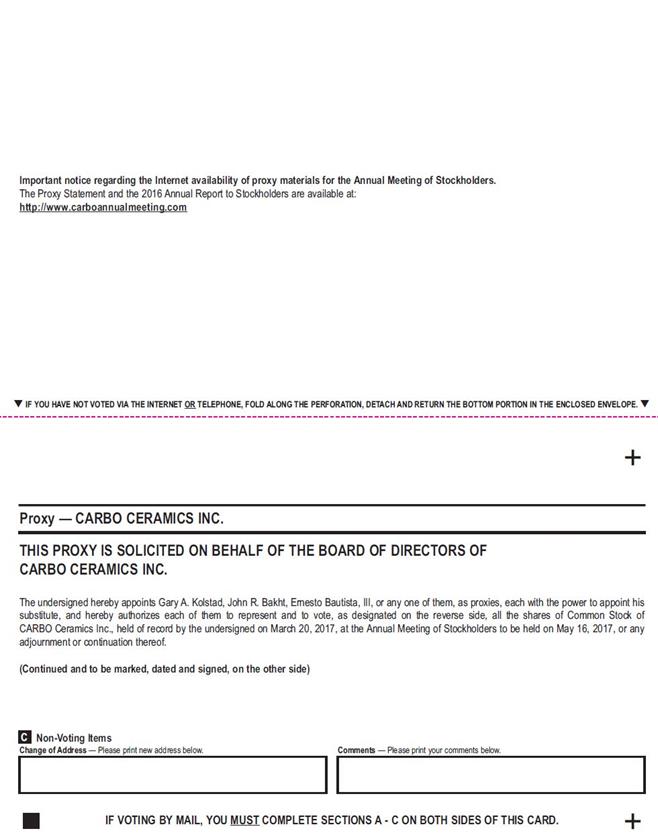 Important notice regarding the Internet availability of proxy materials for the Annual Meeting of Stockholders. The Proxy Statement and the 2016 Annual Report to Stockholders are available at: http://www.carboannualmeeting.com q IF YOU HAVE NOT VOTED VIA THE INTERNET OR TELEPHONE, FOLD ALONG THE PERFORATION, DETACH AND RETURN THE BOTTOM PORTION IN THE ENCLOSED ENVELOPE. q + Proxy — CARBO CERAMICS INC. THIS PROXY IS SOLICITED ON BEHALF OF THE BOARD OF DIRECTORS OF CARBO CERAMICS INC. The undersigned hereby appoints Gary A. Kolstad, John R. Bakht, Ernesto Bautista, III, or any one of them, as proxies, each with the power to appoint his substitute, and hereby authorizes each of them to represent and to vote, as designated on the reverse side, all the shares of Common Stock of CARBO Ceramics Inc., held of record by the undersigned on March 20, 2017, at the Annual Meeting of Stockholders to be held on May 16, 2017, or any adjournment or continuation thereof. (Continued and to be marked, dated and signed, on the other side) C Non-Voting Items Change of Address — Please print new address below. Comments — Please print your comments below. IF VOTING BY MAIL, YOU MUST COMPLETE SECTIONS A - C ON BOTH SIDES OF THIS CARD. +