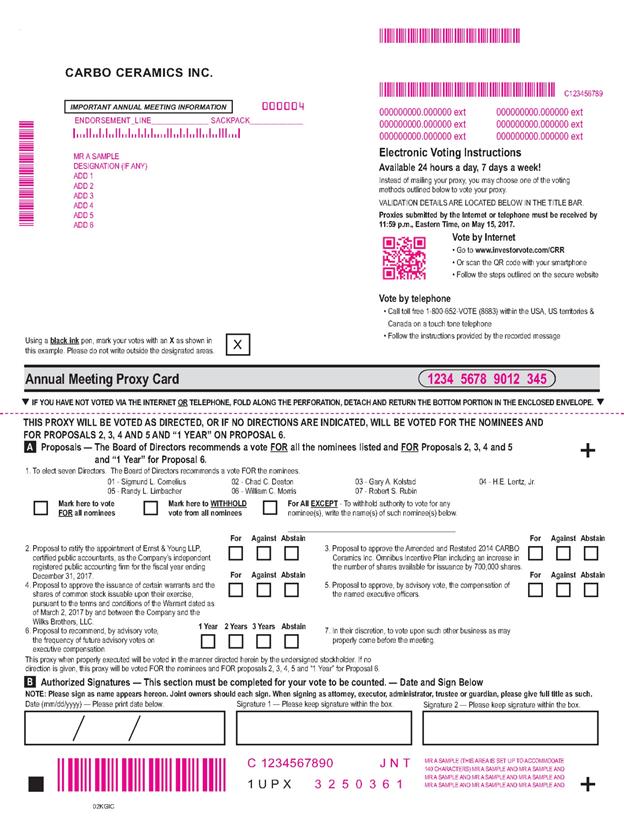 . CARBO CERAMICS INC. MMMMMMMMMMMM MMMMMMMMMMMMMMM C123456789 IMPORTANT ANNUAL MEETING INFORMATION 000004 000000000.000000 ext 000000000.000000 ext ENDORSEMENT_LINE______________ SACKPACK_____________ 000000000.000000 ext 000000000.000000 ext 000000000.000000 ext 000000000.000000 ext MR A SAMPLE DESIGNATION (IF ANY) ADD 1 ADD 2 ADD 3 ADD 4 ADD 5 ADD 6 Using a black ink pen, mark your votes with an X as shown in this example. Please do not write outside the designated areas. Electronic Voting Instructions Available 24 hours a day, 7 days a week! Instead of mailing your proxy, you may choose one of the voting methods outlined below to vote your proxy. VALIDATION DETAILS ARE LOCATED BELOW IN THE TITLE BAR. Proxies submitted by the Internet or telephone must be received by 11:59 p.m., Eastern Time, on May 15, 2017. Vote by Internet • Go to www.investorvote.com/CRR • Or scan the QR code with your smartphone • Follow the steps outlined on the secure website Vote by telephone • Call toll free 1-800-652-VOTE (8683) within the USA, US territories & Canada on a touch tone telephone • Follow the instructions provided by the recorded message Annual Meeting Proxy Card 1234 5678 9012 345 q IF YOU HAVE NOT VOTED VIA THE INTERNET OR TELEPHONE, FOLD ALONG THE PERFORATION, DETACH AND RETURN THE BOTTOM PORTION IN THE ENCLOSED ENVELOPE. q THIS PROXY WILL BE VOTED AS DIRECTED, OR IF NO DIRECTIONS ARE INDICATED, WILL BE VOTED FOR THE NOMINEES AND FOR PROPOSALS 2, 3, 4 AND 5 AND “1 YEAR” ON PROPOSAL 6. A Proposals — The Board of Directors recommends a vote FOR all the nominees listed and FOR Proposals 2, 3, 4 and 5 and “1 Year” for Proposal 6. 1. To elect seven Directors. The Board of Directors recommends a vote FOR the nominees. 01 - Sigmund L. Cornelius 02 - Chad C. Deaton 03 - Gary A. Kolstad 04 - H.E. Lentz, Jr. 05 - Randy L. Limbacher 06 - William C. Morris 07 - Robert S. Rubin Mark here to vote FOR all nominees Mark here to WITHHOLD vote from all nominees For All EXCEPT - To withhold authority to vote for any nominee(s), write the name(s) of such nominee(s) below. 2. Proposal to ratify the appointment of Ernst & Young LLP, certified public accountants, as the Company’s independent registered public accounting firm for the fiscal year ending December 31, 2017. 4. Proposal to approve the issuance of warrants and the shares of common stock issuable upon the exercise of the Warrant, pursuant to the terms and conditions of the Warrant dated as of March 2, 2017 by and between the Company and the Wilks Brothers, LLC. For Against Abstain For Against Abstain 3. Proposal to approve the Amended and Restated 2014 CARBO Ceramics Inc. Omnibus Incentive Plan including an increase in the number of shares available for issuance by 700,000 shares. 5. Proposal to approve, by advisory vote, the compensation of the named executive officers. For Against Abstain For Against Abstain 6. Proposal to recommend, by advisory vote, the frequency of future advisory votes on executive compensation. 1 Year 2 Years 3 Years Abstain 7. In their discretion, to vote upon such other business as may properly come before the meeting. This proxy when properly executed will be voted in the manner directed herein by the undersigned stockholder. If no direction is given, this proxy will be voted FOR the nominees and FOR proposals 2, 3, 4, 5 and “1 Year” for Proposal 6. B Authorized Signatures — This section must be completed for your vote to be counted. — Date and Sign Below NOTE: Please sign as name appears hereon. Joint owners should each sign. When signing as attorney, executor, administrator, trustee or guardian, please give full title as such. Date (mm/dd/yyyy) — Please print date below. Signature 1 — Please keep signature within the box. Signature 2 — Please keep signature within the box. MMMMMMMC 1234567890 J N T MR A SAMPLE (THIS AREA IS SET UP TO ACCOMMODATE 140 CHARACTERS) MR A SAMPLE AND MR A SAMPLE AND 1 U P X 3 2 5 0 3 6 1 MR A SAMPLE AND MR A SAMPLE AND MR A SAMPLE AND MR A SAMPLE AND MR A SAMPLE AND MR A SAMPLE AND 02KGIB .