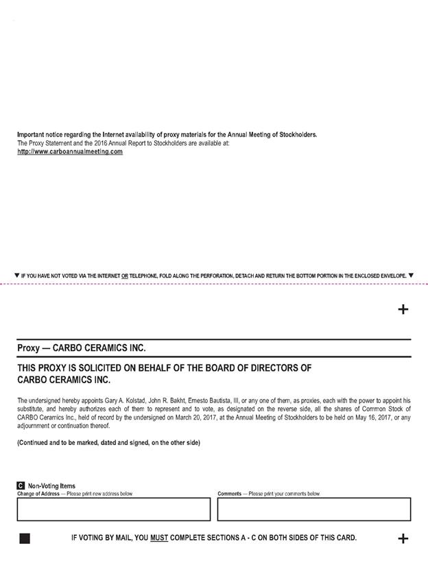 Important notice regarding the Internet availability of proxy materials for the Annual Meeting of Stockholders. The Proxy Statement and the 2016 Annual Report to Stockholders are available at: http://www.carboannualmeeting.com q IF YOU HAVE NOT VOTED VIA THE INTERNET OR TELEPHONE, FOLD ALONG THE PERFORATION, DETACH AND RETURN THE BOTTOM PORTION IN THE ENCLOSED ENVELOPE. q + Proxy — CARBO CERAMICS INC. THIS PROXY IS SOLICITED ON BEHALF OF THE BOARD OF DIRECTORS OF CARBO CERAMICS INC. The undersigned hereby appoints Gary A. Kolstad, John R. Bakht, Ernesto Bautista, III, or any one of them, as proxies, each with the power to appoint his substitute, and hereby authorizes each of them to represent and to vote, as designated on the reverse side, all the shares of Common Stock of CARBO Ceramics Inc., held of record by the undersigned on March 20, 2017, at the Annual Meeting of Stockholders to be held on May 16, 2017, or any adjournment or continuation thereof. (Continued and to be marked, dated and signed, on the other side) C Non-Voting Items Change of Address — Please print new address below. Comments — Please print your comments below. IF VOTING BY MAIL, YOU MUST COMPLETE SECTIONS A - C ON BOTH SIDES OF THIS CARD. +