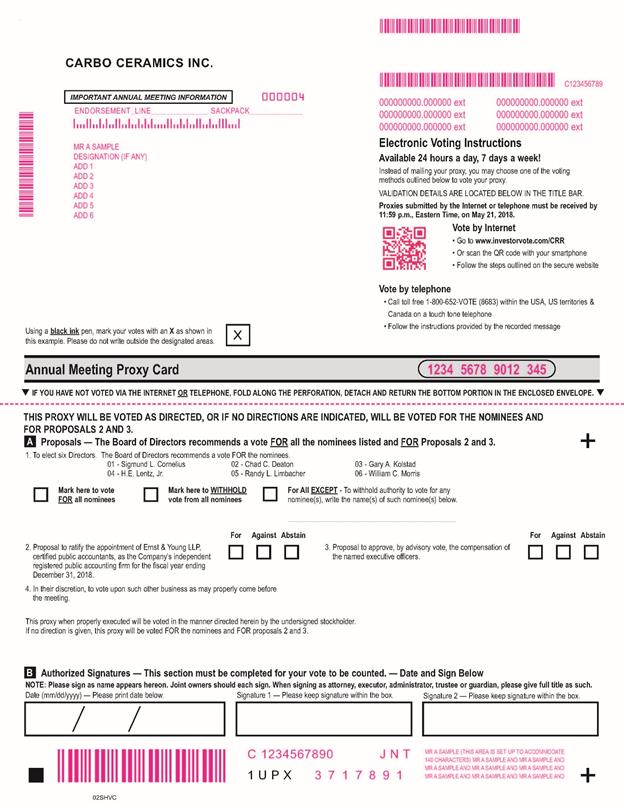 . MMMMMMMMMMMM CARBO CERAMICS INC. IMPORTANT ANNUAL MEETING INFORMATION 000004 000000000.000000 ext 000000000.000000 ext C123456789MMMMMMMMMMMMMMM MMMMMMMMMENDORSEMENT_LINE______________ SACKPACK_____________ MR A SAMPLE DESIGNATION (IF ANY) ADD 1 ADD 2 ADD 3 ADD 4 ADD 5 ADD 6 Using a black ink pen, mark your votes with an X as shown in this example. Please do not write outside the designated areas. X 000000000.000000 ext 000000000.000000 ext 000000000.000000 ext 000000000.000000 ext Electronic Voting Instructions Available 24 hours a day, 7 days a week! Instead of mailing your proxy, you may choose one of the voting methods outlined below to vote your proxy. VALIDATION DETAILS ARE LOCATED BELOW IN THE TITLE BAR. Proxies submitted by the Internet or telephone must be received by11:59 p.m., Eastern Time, on May 21, 2018. Vote by Internet • Go to www.investorvote.com/CRR • Or scan the QR code with your smartphone • Follow the steps outlined on the secure website Vote by telephone • Call toll free 1-800-652-VOTE (8683) within the USA, US territories & Canada on a touch tone telephone • Follow the instructions provided by the recorded message Annual Meeting Proxy Card 1234 5678 9012 345 • IF YOU HAVE NOT VOTED VIA THE INTERNET OR TELEPHONE, FOLD ALONG THE PERFORATION, DETACH AND RETURN THE BOTTOM PORTION IN THE ENCLOSED ENVELOPE. • THIS PROXY WILL BE VOTED AS DIRECTED, OR IF NO DIRECTIONS ARE INDICATED, WILL BE VOTED FOR THE NOMINEES AND FOR PROPOSALS 2 AND 3. A Proposals — The Board of Directors recommends a vote FOR all the nominees listed and FOR Proposals 2 and 3. +1. To elect six Directors. The Board of Directors recommends a vote FOR the nominees. 01 - Sigmund L. Cornelius 02 - Chad C. Deaton 03 - Gary A. Kolstad 04 - H.E. Lentz, Jr. 05 - Randy L. Limbacher 06 - William C. Morris Mark here to vote Mark here to WITHHOLD For All EXCEPT - To withhold authority to vote for any FOR all nominees vote from all nominees nominee(s), write the name(s) of such nominee(s) below. For Against Abstain For Against Abstain 2. Proposal to ratify the appointment of Ernst & Young LLP, 3. Proposal to approve, by advisory vote, the compensation of certified public accountants, as the Company’s independent the named executive officers. registered public accounting firm for the fiscal year ending December 31, 2018. 4. In their discretion, to vote upon such other business as may properly come before the meeting. This proxy when properly executed will be voted in the manner directed herein by the undersigned stockholder. If no direction is given, this proxy will be voted FOR the nominees and FOR proposals 2 and 3. B Authorized Signatures — This section must be completed for your vote to be counted. — Date and Sign Below NOTE: Please sign as name appears hereon. Joint owners should each sign. When signing as attorney, executor, administrator, trustee or guardian, please give full title as such. Date (mm/dd/yyyy) — Please print date below. Signature 1 — Please keep signature within the box. Signature 2 — Please keep signature within the box. MR A SAMPLE (THIS AREA IS SET UP TO ACCOMMODATE C 1234567890 J N T 140 CHARACTERS) MR A SAMPLE AND MR A SAMPLE AND MR A SAMPLE AND MR A SAMPLE AND MR A SAMPLE AND 1UPX 3717891 MR A SAMPLE AND MR A SAMPLE AND MR A SAMPLE AND MMMMMMM + 02SHVC