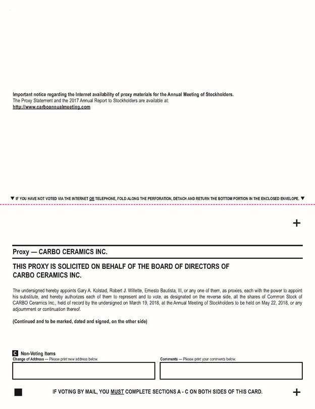 . Important notice regarding the Internet availability of proxy materials for the Annual Meeting of Stockholders. The Proxy Statement and the 2017 Annual Report to Stockholders are available at: http://www.carboannualmeeting.com • IF YOU HAVE NOT VOTED VIA THE INTERNET OR TELEPHONE, FOLD ALONG THE PERFORATION, DETACH AND RETURN THE BOTTOM PORTION IN THE ENCLOSED ENVELOPE. • + Proxy — CARBO CERAMICS INC. THIS PROXY IS SOLICITED ON BEHALF OF THE BOARD OF DIRECTORS OF CARBO CERAMICS INC. The undersigned hereby appoints Gary A. Kolstad, Robert J. Willette, Ernesto Bautista, III, or any one of them, as proxies, each with the power to appoint his substitute, and hereby authorizes each of them to represent and to vote, as designated on the reverse side, all the shares of Common Stock of CARBO Ceramics Inc., held of record by the undersigned on March 19, 2018, at the Annual Meeting of Stockholders to be held on May 22, 2018, or any adjournment or continuation thereof. (Continued and to be marked, dated and signed, on the other side) Non-Voting Items Change of Address — Please print new address below. Comments — Please print your comments below. IF VOTING BY MAIL, YOU MUST COMPLETE SECTIONS A - C ON BOTH SIDES OF THIS CARD. +