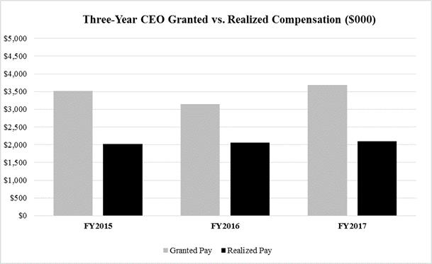 The CEO’s long-term performance-based cash award target for the cumulative 2015-2017 period (includes 2015, 2016, 2017, and 2015-2017 performance cycles) was $621,988 and he earned a payout of $314,633. This value differs from the amount in the 2017 Non-Equity Incentive Plan Compensation column in the Summary Compensation Table, on Page 23 of the 2018 Proxy Statement due to disclosure rules. The Summary Compensation Table reflects the value of awards earned for performance cycles covering fiscal 2017, rather than the actual value the CEO received for the cumulative three-year award. |