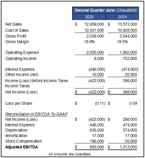 | ● | Net sales: $12.7 million, a decrease of $0.9 million or 6.7% decrease from $13.6 million in Q2 2024. |