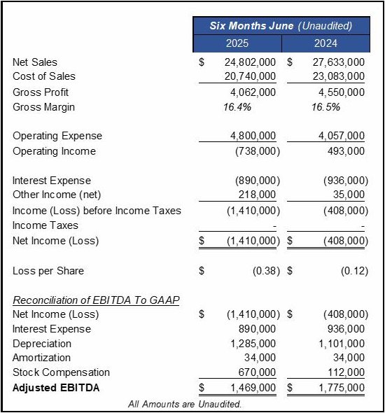 | ● | Net sales: $24.8 million, down $2.8 million or 10.2% decrease from $27.6 million in the first half of 2024. |