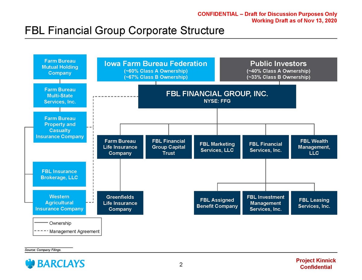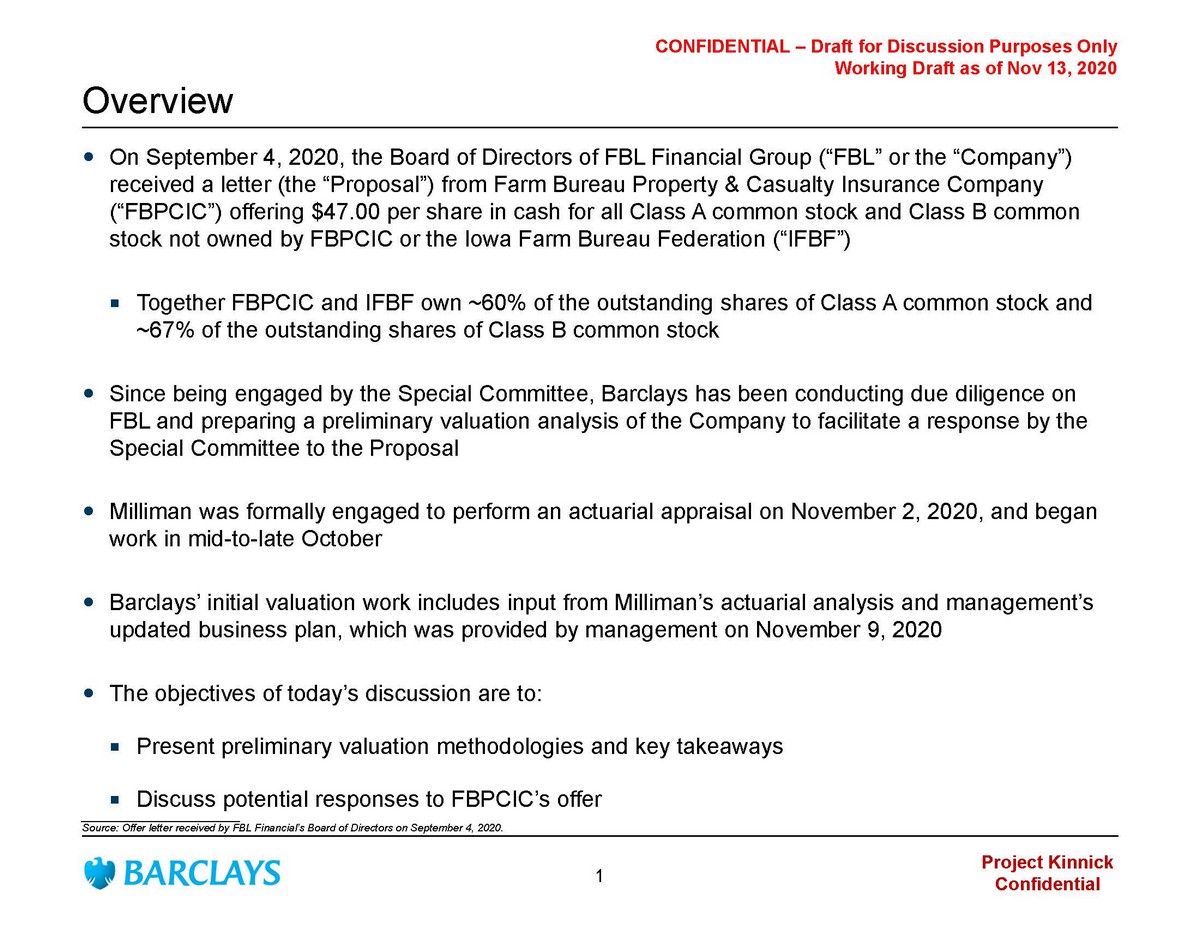 Project Kinnick Confidential CONFIDENTIAL – Draft for Discussion Purposes Only Working Draft as of Nov 13, 2020 Overview On September 4, 2020, the Board of Directors of FBL Financial Group (“FBL” or the “Company”) received a letter (the “Proposal”) from Farm Bureau Property & Casualty Insurance Company (“FBPCIC”) offering $47.00 per share in cash for all Class A common stock and Class B common stock not owned by FBPCIC or the Iowa Farm Bureau Federation (“IFBF”) Together FBPCIC and IFBF own ~60% of the outstanding shares of Class A common stock and ~67% of the outstanding shares of Class B common stock Since being engaged by the Special Committee, Barclays has been conducting due diligence on FBL and preparing a preliminary valuation analysis of the Company to facilitate a response by the Special Committee to the Proposal Milliman was formally engaged to perform an actuarial appraisal on November 2, 2020, and began work in mid - to - late October Barclays’ initial valuation work includes input from Milliman’s actuarial analysis and management’s updated business plan, which was provided by management on November 9, 2020 The objectives of today’s discussion are to: Present preliminary valuation methodologies and key takeaways Discuss potential responses to FBPCIC’s offer ___________________________ Source : Offer letter received by FBL Financial’s Board of Directors on September 4, 2020. 1