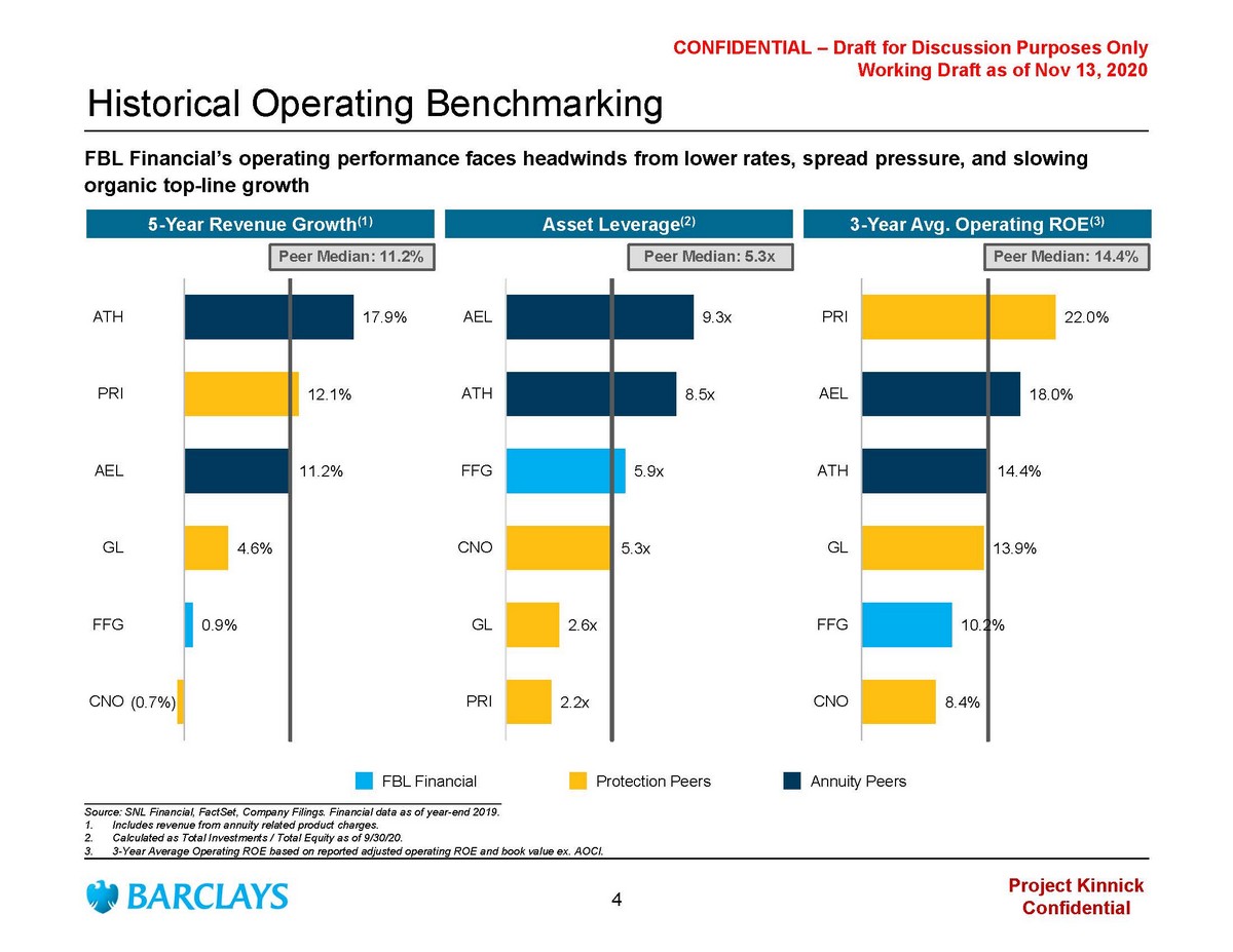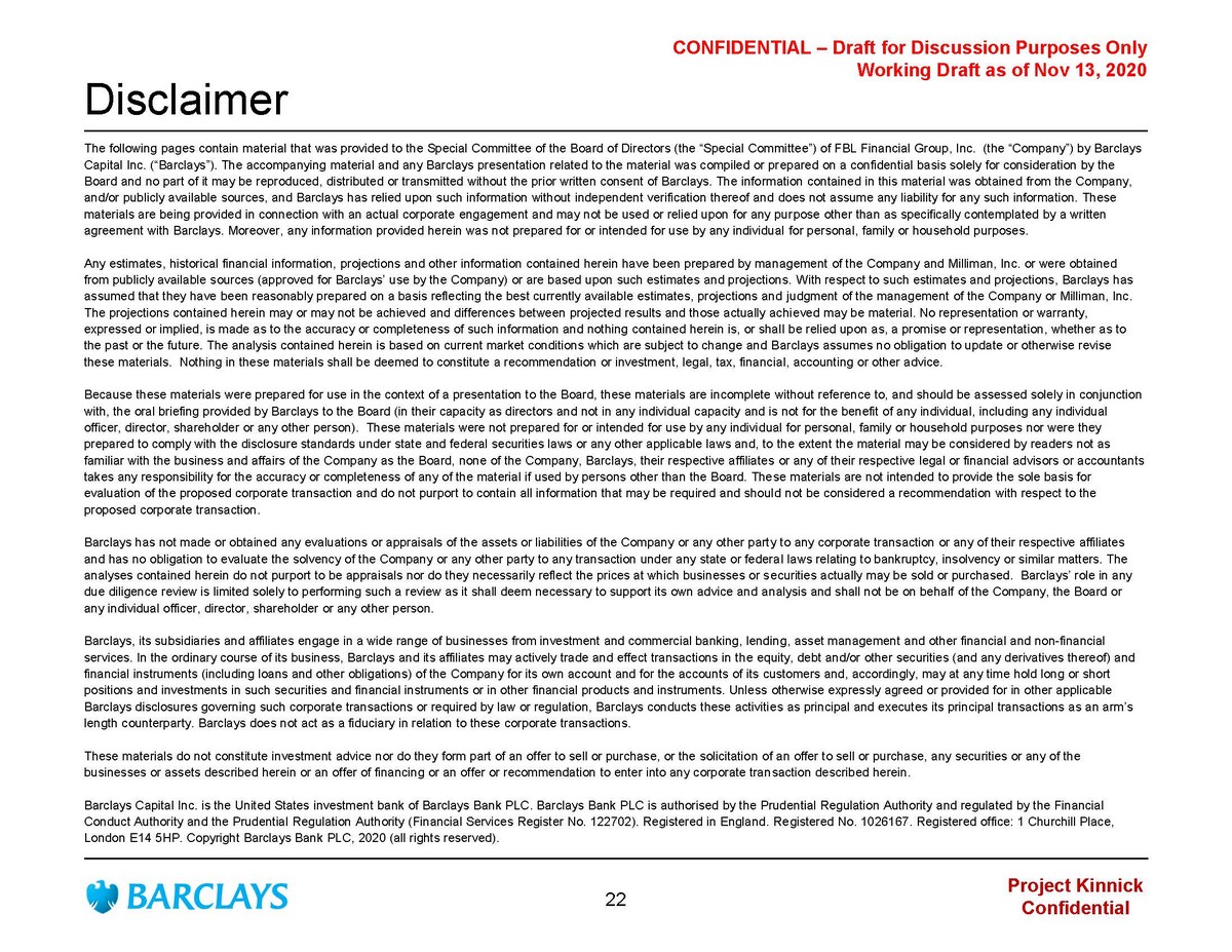 Project Kinnick Confidential CONFIDENTIAL – Draft for Discussion Purposes Only Working Draft as of Nov 13, 2020 Disclaimer The following pages contain material that was provided to the Special Committee of the Board of Directors (the “Special Commi tte e”) of FBL Financial Group, Inc. (the “Company”) by Barclays Capital Inc. (“Barclays”). The accompanying material and any Barclays presentation related to the material was compiled or pr epa red on a confidential basis solely for consideration by the Board and no part of it may be reproduced, distributed or transmitted without the prior written consent of Barclays. The info rma tion contained in this material was obtained from the Company, and/or publicly available sources, and Barclays has relied upon such information without independent verification thereof and do es not assume any liability for any such information. These materials are being provided in connection with an actual corporate engagement and may not be used or relied upon for any pur pos e other than as specifically contemplated by a written agreement with Barclays. Moreover, any information provided herein was not prepared for or intended for use by any individual fo r personal, family or household purposes. Any estimates, historical financial information, projections and other information contained herein have been prepared by man age ment of the Company and Milliman , Inc. or were obtained from publicly available sources (approved for Barclays’ use by the Company) or are based upon such estimates and projections. Wi th respect to such estimates and projections, Barclays has assumed that they have been reasonably prepared on a basis reflecting the best currently available estimates, projections and ju dgment of the management of the Company or Milliman , Inc. The projections contained herein may or may not be achieved and differences between projected results and those actually achi eve d may be material. No representation or warranty, expressed or implied, is made as to the accuracy or completeness of such information and nothing contained herein is, or shal l b e relied upon as, a promise or representation, whether as to the past or the future. The analysis contained herein is based on current market conditions which are subject to change and B arc lays assumes no obligation to update or otherwise revise these materials. Nothing in these materials shall be deemed to constitute a recommendation or investment, legal, tax, financ ial , accounting or other advice. Because these materials were prepared for use in the context of a presentation to the Board, these materials are incomplete w ith out reference to, and should be assessed solely in conjunction with, the oral briefing provided by Barclays to the Board (in their capacity as directors and not in any individual capacity and is not for the benefit of any individual, including any individual officer, director, shareholder or any other person). These materials were not prepared for or intended for use by any indivi dua l for personal, family or household purposes nor were they prepared to comply with the disclosure standards under state and federal securities laws or any other applicable laws and, to th e extent the material may be considered by readers not as familiar with the business and affairs of the Company as the Board, none of the Company, Barclays, their respective affiliate s o r any of their respective legal or financial advisors or accountants takes any responsibility for the accuracy or completeness of any of the material if used by persons other than the Board. The se materials are not intended to provide the sole basis for evaluation of the proposed corporate transaction and do not purport to contain all information that may be required and shoul d n ot be considered a recommendation with respect to the proposed corporate transaction. Barclays has not made or obtained any evaluations or appraisals of the assets or liabilities of the Company or any other part y t o any corporate transaction or any of their respective affiliates and has no obligation to evaluate the solvency of the Company or any other party to any transaction under any state or federa l l aws relating to bankruptcy, insolvency or similar matters. The analyses contained herein do not purport to be appraisals nor do they necessarily reflect the prices at which businesses or s ecu rities actually may be sold or purchased. Barclays’ role in any due diligence review is limited solely to performing such a review as it shall deem necessary to support its own advice and a nal ysis and shall not be on behalf of the Company, the Board or any individual officer, director, shareholder or any other person. Barclays, its subsidiaries and affiliates engage in a wide range of businesses from investment and commercial banking, lendin g, asset management and other financial and non - financial services. In the ordinary course of its business, Barclays and its affiliates may actively trade and effect transactions in t he equity, debt and/or other securities (and any derivatives thereof) and financial instruments (including loans and other obligations) of the Company for its own account and for the accounts of its cus tomers and, accordingly, may at any time hold long or short positions and investments in such securities and financial instruments or in other financial products and instruments. Unless ot herwise expressly agreed or provided for in other applicable Barclays disclosures governing such corporate transactions or required by law or regulation, Barclays conducts these activiti es as principal and executes its principal transactions as an arm’s length counterparty. Barclays does not act as a fiduciary in relation to these corporate transactions. These materials do not constitute investment advice nor do they form part of an offer to sell or purchase, or the solicitatio n o f an offer to sell or purchase, any securities or any of the