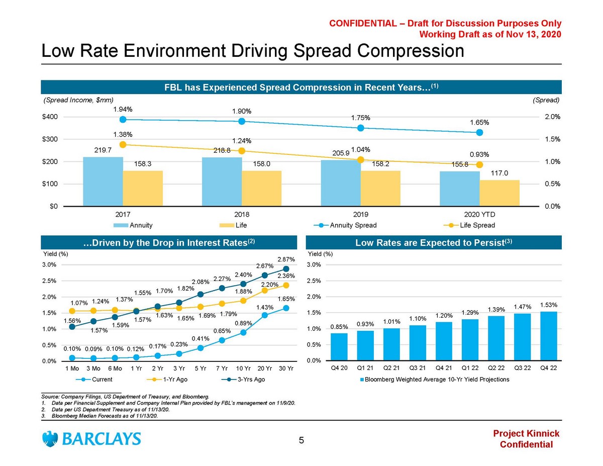 Project Kinnick Confidential CONFIDENTIAL – Draft for Discussion Purposes Only Working Draft as of Nov 13, 2020 219.7 218.8 205.9 155.8 158.3 158.0 158.2 117.0 1.94% 1.90% 1.75% 1.65% 1.38% 1.24% 1.04% 0.93% 0.0% 0.5% 1.0% 1.5% 2.0% $0 $100 $200 $300 $400 2017 2018 2019 2020 YTD (Spread) (Spread Income, $mm) Annuity Life Annuity Spread Life Spread Low Rate Environment Driving Spread Compression FBL has Experienced Spread Compression in Recent Years… (1) …Driven by the Drop in Interest Rates (2) 0.85% 0.93% 1.01% 1.10% 1.20% 1.29% 1.39% 1.47% 1.53% 0.0% 0.5% 1.0% 1.5% 2.0% 2.5% 3.0% Q4 20 Q1 21 Q2 21 Q3 21 Q4 21 Q1 22 Q2 22 Q3 22 Q4 22 Yield (%) Bloomberg Weighted Average 10-Yr Yield Projections Low Rates are Expected to Persist (3) 0.10% 0.09% 0.10% 0.12% 0.17% 0.23% 0.41% 0.65% 0.89% 1.43% 1.65% 1.56% 1.57% 1.59% 1.57% 1.63% 1.65% 1.69% 1.79% 1.88% 2.20% 2.36% 1.07% 1.24% 1.37% 1.55% 1.70% 1.82% 2.08% 2.27% 2.40% 2.67% 2.87% 0.0% 0.5% 1.0% 1.5% 2.0% 2.5% 3.0% 1 Mo 3 Mo 6 Mo 1 Yr 2 Yr 3 Yr 5 Yr 7 Yr 10 Yr 20 Yr 30 Yr Yield (%) Current 1-Yr Ago 3-Yrs Ago ___________________________ Source: Company Filings, US Department of Treasury, and Bloomberg. 1. Data per Financial S upplement and Company Internal Plan provided by FBL’s m anagement on 11/9/20. 2. Data per US Department Treasury as of 11/13/20. 3. Bloomberg Median Forecasts as of 11/13/20. 5