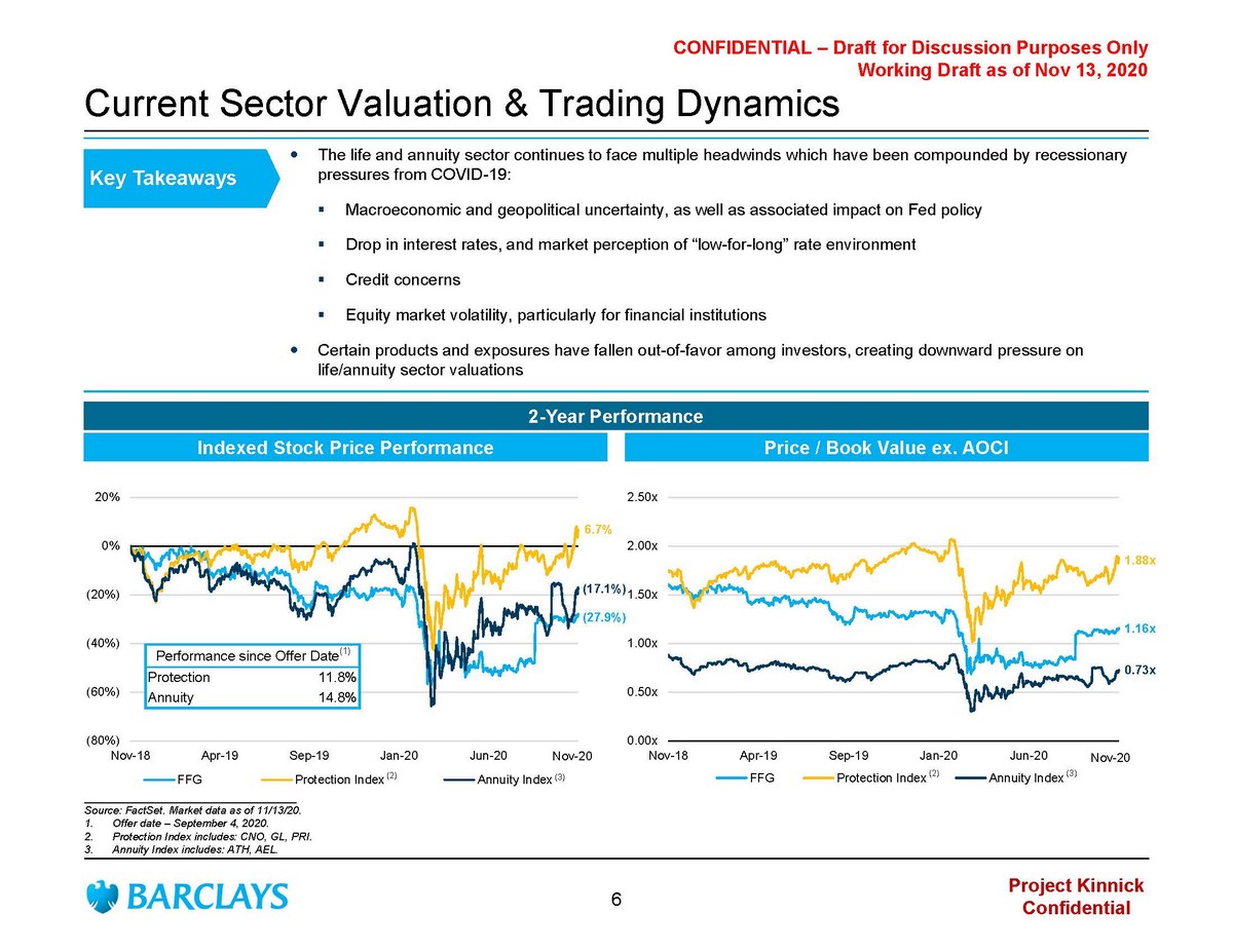 Project Kinnick Confidential CONFIDENTIAL – Draft for Discussion Purposes Only Working Draft as of Nov 13, 2020 0.00x 0.50x 1.00x 1.50x 2.00x 2.50x Nov-18 Apr-19 Sep-19 Jan-20 Jun-20 Nov-20 FFG Protection Index Annuity Index (80%) (60%) (40%) (20%) 0% 20% Nov-18 Apr-19 Sep-19 Jan-20 Jun-20 Nov-20 FFG Protection Index Annuity Index The life and annuity sector continues to face multiple headwinds which have been compounded by recessionary pressures from COVID - 19: ▪ Macroeconomic and geopolitical uncertainty, as well as associated impact on Fed policy ▪ Drop in interest rates, and market perception of “low - for - long” rate environment ▪ Credit concerns ▪ Equity market volatility, particularly for financial institutions Certain products and exposures have fallen out - of - favor among investors, creating downward pressure on life/annuity sector valuations Current Sector Valuation & Trading Dynamics Key Takeaways Indexed Stock Price Performance 2 - Year Performance Price / Book Value ex. AOCI (3) ___________________________________ Source: FactSet . Market data as of 11/13/20. 1. Offer date – September 4, 2020 . 2. Protection Index includes: CNO, GL, PRI. 3. Annuity Index includes: ATH, AEL. (2) (2) ( 3 ) 6.7% (17.1%) (27.9%) 1.88x 0.73x 1.16x Nov - 20 Nov - 20 Performance since Offer Date (1) Protection 11.8% Annuity 14.8% 6