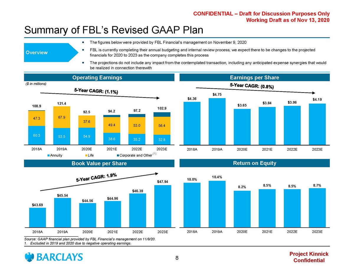 Project Kinnick Confidential CONFIDENTIAL – Draft for Discussion Purposes Only Working Draft as of Nov 13, 2020 Summary of FBL’s Revised GAAP Plan The figures below were provided by FBL Financial’s management on November 9, 2020 FBL is currently completing their annual budgeting and internal review process; we expect there to be changes to the projecte d financials for 2020 to 2023 as the company completes this process The projections do not include any impact from the contemplated transaction, including any anticipated expense synergies that wo uld be realized in connection therewith Overview Operating Earnings Earnings per Share Book Value per Share Return on Equity 60.3 53.5 54.9 38.6 35.2 32.8 47.3 67.9 37.6 49.4 53.0 56.4 2018A 2019A 2020E 2021E 2022E 2023E ($ in millions) Annuity Life Corporate and Other $4.36 $4.75 $3.65 $3.84 $3.96 $4.19 2018A 2019A 2020E 2021E 2022E 2023E 108.9 121.4 92.5 94.2 97.2 102.9 $43.69 $45.54 $44.56 $44.96 $46.39 $47.94 2018A 2019A 2020E 2021E 2022E 2023E 10.0% 10.4% 8.2% 8.5% 8.5% 8.7% 2018A 2019A 2020E 2021E 2022E 2023E ___________________________ Source: GAAP financial plan provided by FBL Financial’s management on 11/9/20. 1. Excluded in 2019 and 2020 due to negative operating earnings. (1) 8