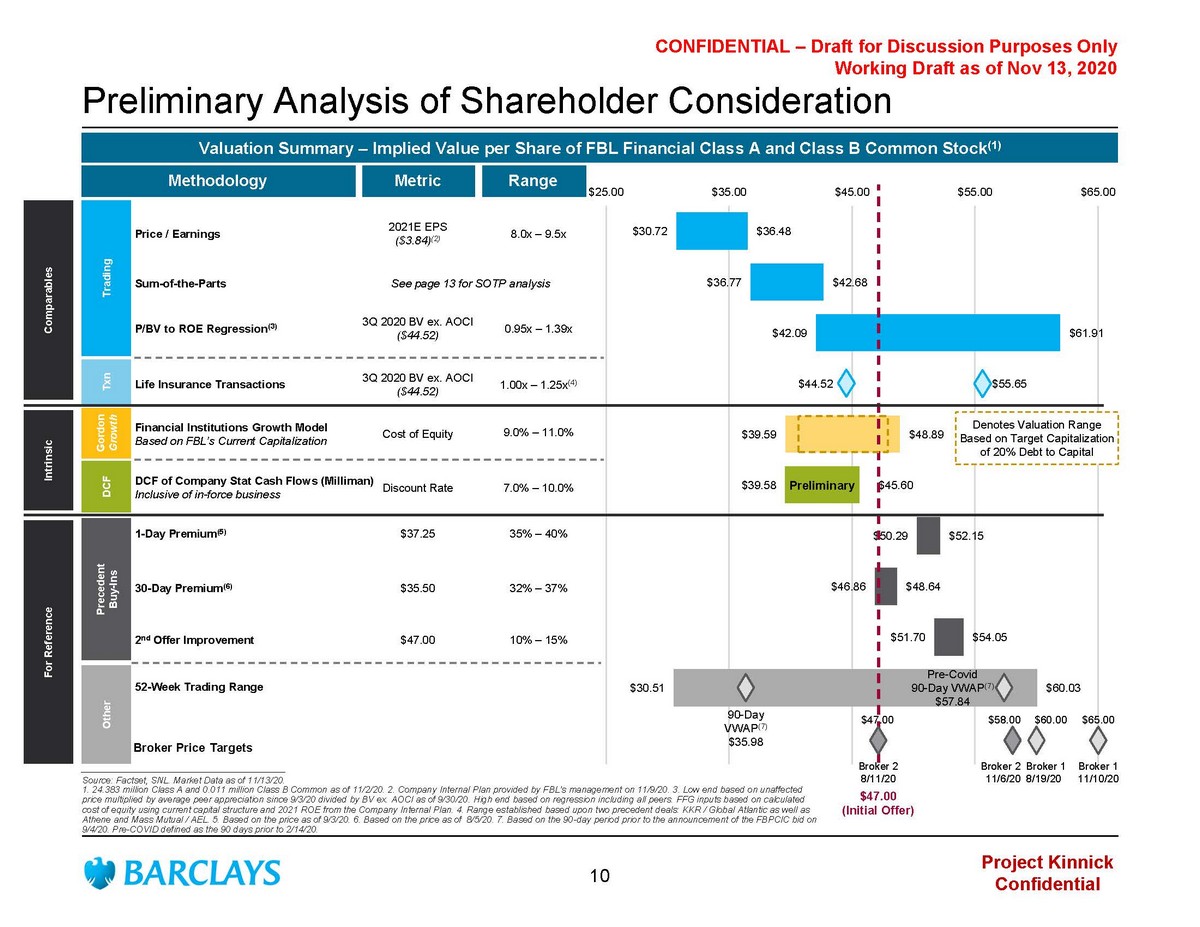 Project Kinnick Confidential CONFIDENTIAL – Draft for Discussion Purposes Only Working Draft as of Nov 13, 2020 $30.72 $36.77 $42.09 $44.52 $39.59 $39.58 $50.29 $46.86 $51.70 $30.51 $36.48 $42.68 $61.91 $55.65 $48.89 $45.60 $52.15 $48.64 $54.05 $60.03 $25.00 $35.00 $45.00 $55.00 $65.00 Preliminary Analysis of Shareholder Consideration ________________________________________ Source: Factset , SNL. Market Data as of 11/13/20. 1. 24.383 million Class A and 0.011 million Class B Common as of 11/2/20. 2. Company Internal Plan provided by FBL’s management on 11/9/20 . 3. Low end based on unaffected price multiplied by average peer appreciation since 9/3/20 divided by BV ex. AOCI as of 9/30/20. High end based on regression including all peers. FFG inputs based on calculated cost of equity using current capital structure and 2021 ROE from the Company Internal Plan. 4. Range established based upon t wo precedent deals: KKR / Global Atlantic as well as Athene and Mass Mutual / AEL. 5. Based on the price as of 9/3/20. 6. Based on the price as of 8/5/20. 7. Based on the 90 - day period prior to the announcement of the FBPCIC bid on 9/4/20. Pre - COVID defined as the 90 days prior to 2/14/20 . Valuation Summary – Implied Value per Share of FBL Financial Class A and Class B Common Stock (1) DCF of Company Stat Cash Flows ( Milliman ) Inclusive of in - force business 7.0% – 10.0% Gordon Growth Methodology Metric Range Discount Rate Financial Institutions Growth Model Based on FBL’s Current Capitalization 9.0% – 11.0% Cost of Equity Trading Price / Earnings 8.0x – 9.5x 2021E EPS ($3.84) (2) Precedent Buy - Ins 1 - Day Premium (5) 35% – 40 % 2 nd Offer Improvement 10% – 1 5% 30 - Day Premium (6) 32% – 37% Other 52 - Week Trading Range Broker Price Targets Txn Life Insurance Transactions 1.00x – 1.25x (4) $37.25 Broker 2 8/11/20 Broker 1 8/19/20 Broker 1 11/10/20 $47.00 (Initial Offer) $35.50 $47.00 $47.00 $60.00 $65.00 3 Q 2020 BV ex. AOCI ($44.52) DCF For Reference Denotes Valuation Range Based on Target Capitalization of 20% Debt to Capital P/BV to ROE Regression (3) 0.95x – 1.39x Sum - of - the - Parts See page 13 for SOTP analysis 3 Q 2020 BV ex. AOCI ($44.52) Intrinsic Comparables $58.00 Broker 2 11/6/20 90 - Day VWAP (7) $35.98 Pre - Covid 90 - Day VWAP (7) $57.84 Preliminary 10