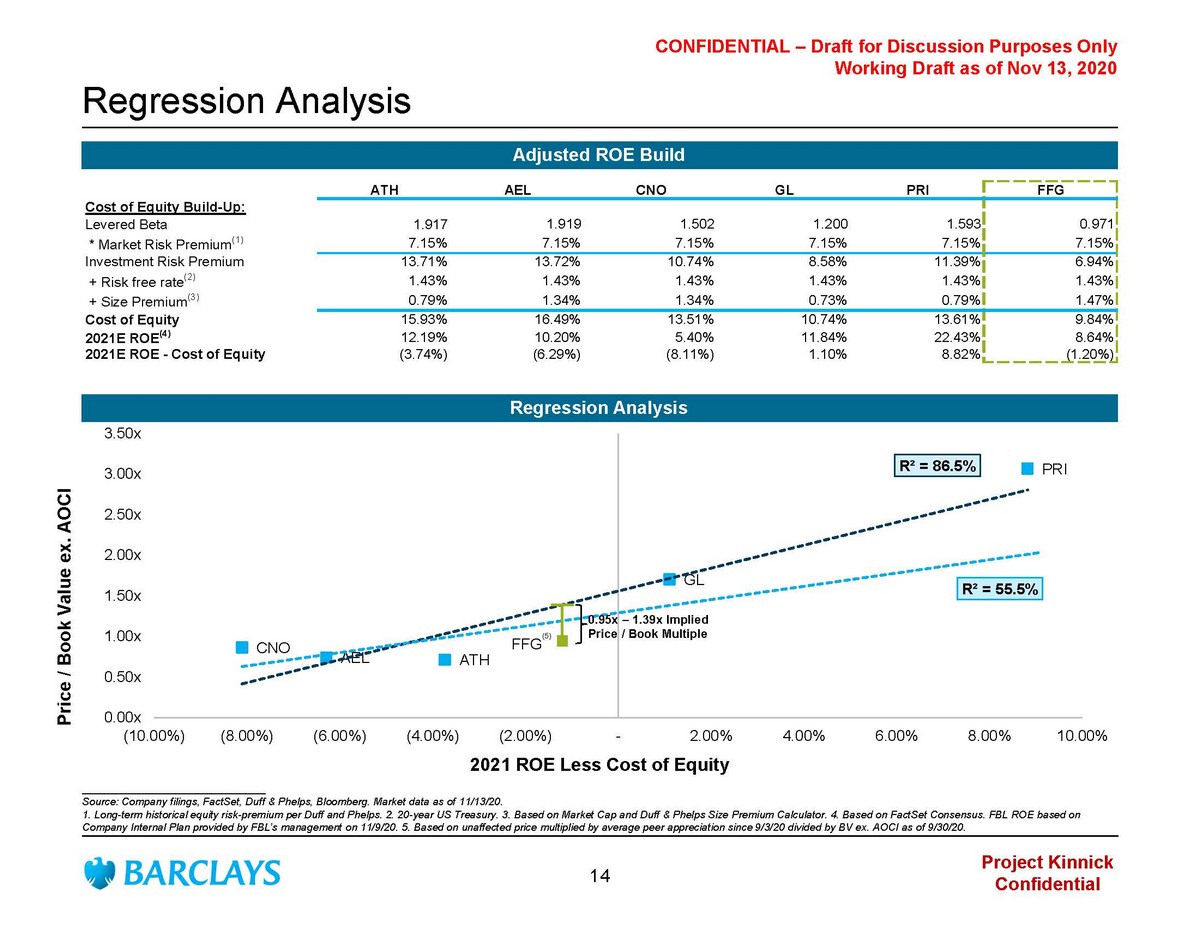 Project Kinnick Confidential CONFIDENTIAL – Draft for Discussion Purposes Only Working Draft as of Nov 13, 2020 ATH AEL CNO GL PRI FFG R² = 86.5% R² = 55.5% 0.00x 0.50x 1.00x 1.50x 2.00x 2.50x 3.00x 3.50x (10.00%) (8.00%) (6.00%) (4.00%) (2.00%) - 2.00% 4.00% 6.00% 8.00% 10.00% ___________________________ Source: Company filings, FactSet, Duff & Phelps, Bloomberg. Market data as of 11/13/20. 1. Long - term historical equity risk - premium per Duff and Phelps. 2. 20 - year US Treasury. 3. Based on Market Cap and Duff & Phelp s Size Premium Calculator. 4. Based on FactSet Consensus. FBL ROE based on Company Internal Plan provided by FBL’s management on 11/9/20. 5. Based on unaffected price multiplied by average peer appreciation since 9/3/20 divided by BV ex. AOCI as of 9/30/20. Regression Analysis Regression Analysis Price / Book Value ex. AOCI 2021 ROE Less Cost of Equity Adjusted ROE Build ATH AEL CNO GL PRI FFG Cost of Equity Build-Up: Levered Beta 1.917 1.919 1.502 1.200 1.593 0.971 * Market Risk Premium (1) 7.15% 7.15% 7.15% 7.15% 7.15% 7.15% Investment Risk Premium 13.71% 13.72% 10.74% 8.58% 11.39% 6.94% + Risk free rate (2) 1.43% 1.43% 1.43% 1.43% 1.43% 1.43% + Size Premium (3) 0.79% 1.34% 1.34% 0.73% 0.79% 1.47% Cost of Equity 15.93% 16.49% 13.51% 10.74% 13.61% 9.84% 2021E ROE (4) 12.19% 10.20% 5.40% 11.84% 22.43% 8.64% 2021E ROE - Cost of Equity (3.74%) (6.29%) (8.11%) 1.10% 8.82% (1.20%) (5) 0.95x – 1.39x Implied Price / Book Multiple 14