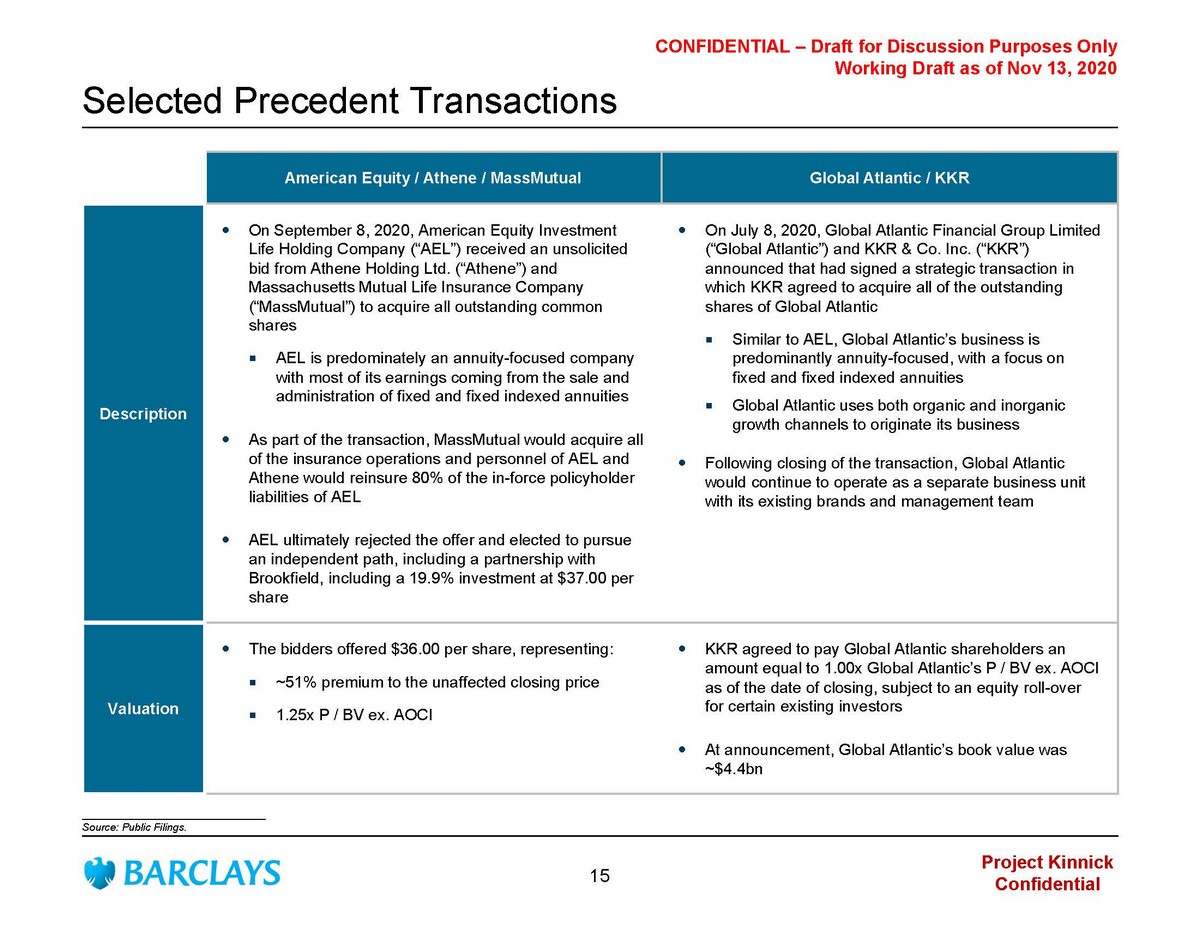 Project Kinnick Confidential CONFIDENTIAL – Draft for Discussion Purposes Only Working Draft as of Nov 13, 2020 Selected Precedent Transactions American Equity / Athene / MassMutual Global Atlantic / KKR Description On September 8, 2020 , American Equity Investment Life Holding Company (“AEL”) received an unsolicited bid from Athene Holding Ltd. (“Athene”) and Massachusetts Mutual Life Insurance Company (“MassMutual”) to acquire all outstanding common shares AEL is predominately an annuity - focused company with most of its earnings coming from the sale and administration of fixed and fixed indexed annuities As part of the transaction, MassMutual would acquire all of the insurance operations and personnel of AEL and Athene would reinsure 80% of the in - force policyholder liabilities of AEL AEL ultimately rejected the offer and elected to pursue an independent path, including a partnership with Brookfield, including a 19.9% investment at $37.00 per share On July 8, 2020 , Global Atlantic Financial Group Limited (“Global Atlantic”) and KKR & Co. Inc. (“KKR”) announced that had signed a strategic transaction in which KKR agreed to acquire all of the outstanding shares of Global Atlantic Similar to AEL, Global Atlantic’s business is predominantly annuity - focused, with a focus on fixed and fixed indexed annuities Global Atlantic uses both organic and inorganic growth channels to originate its business Following closing of the transaction, Global Atlantic would continue to operate as a separate business unit with its existing brands and management team Valuation The bidders offered $36.00 per share, representing: ~51% premium to the unaffected closing price 1.25x P / BV ex. AOCI KKR agreed to pay Global Atlantic shareholders an amount equal to 1.00x Global Atlantic’s P / BV ex. AOCI as of the date of closing, subject to an equity roll - over for certain existing investors At announcement, Global Atlantic’s book value was ~$4.4bn ___________________________ Source: Public Filings. 15