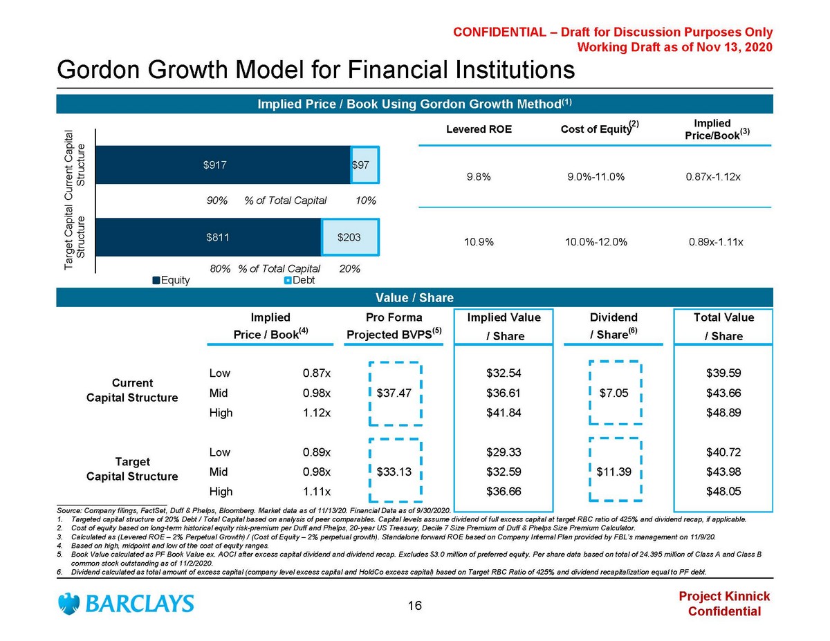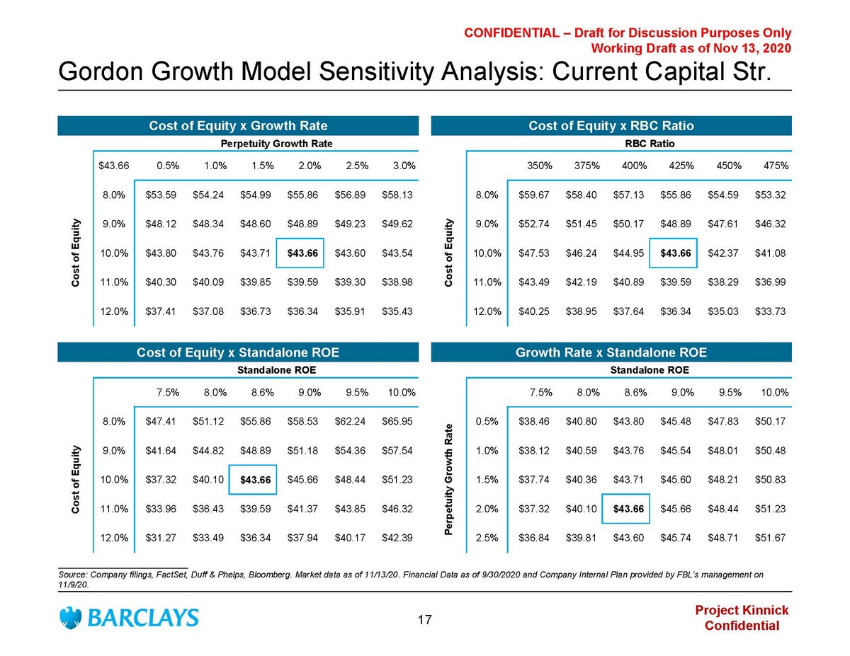Project Kinnick Confidential CONFIDENTIAL – Draft for Discussion Purposes Only Working Draft as of Nov 13, 2020 $811 $917 $203 $97 Target Capital Structure Current Capital Structure Equity Debt Levered ROE Cost of Equity Implied Price/Book 9.8% 9.0% - 11.0% 0.87 x - 1.12x 10.9% 10.0% - 12.0% 0.89x - 1.11x Gordon Growth Model for Financial Institutions Implied Price / Book Using Gordon Growth Method (1) Value / Share (2) ___________________________ Source: Company filings, FactSet , Duff & Phelps, Bloomberg. Market data as of 11/13/20. Financial Data as of 9/30/2020. 1. Targeted capital structure of 20% Debt / Total Capital based on analysis of peer comparables . Capital levels assume dividend of full excess capital at target RBC ratio of 425% and dividend recap, if applicable. 2. Cost of equity based on long - term historical equity risk - premium per Duff and Phelps, 20 - year US Treasury, Decile 7 Size Premium of D uff & Phelps Size Premium Calculator. 3. Calculated as (Levered ROE – 2% Perpetual Growth) / (Cost of Equity – 2% perpetual growth). Standalone f orward ROE based on Company Internal Plan provided by FBL’s management on 11/9/20. 4. Based on high, midpoint and low of the cost of equity ranges. 5. Book Value calculated as PF Book Value ex. AOCI after excess capital dividend and dividend recap. Excludes $3.0 million of preferred equity. Per share data b ased on total of 24.395 million of Class A and Class B common stock outstanding as of 11/2/2020. 6. Dividend calculated as total amount of excess capital (company level excess capital and HoldCo excess capital) based on Target RBC Ratio of 425% and dividend recapitalization equal to PF debt. 90% 10% % of Total Capital 80% 20% % of Total Capital (3) Implied Pro Forma Implied Value Dividend Total Value Price / Book (4) Projected BVPS (5) / Share / Share (6) / Share Low 0.87x $32.54 $39.59 Mid 0.98x $37.47 $36.61 $7.05 $43.66 High 1.12x $41.84 $48.89 Low 0.89x $29.33 $40.72 Mid 0.98x $33.13 $32.59 $11.39 $43.98 High 1.11x $36.66 $48.05 Current Capital Structure Target Capital Structure 16