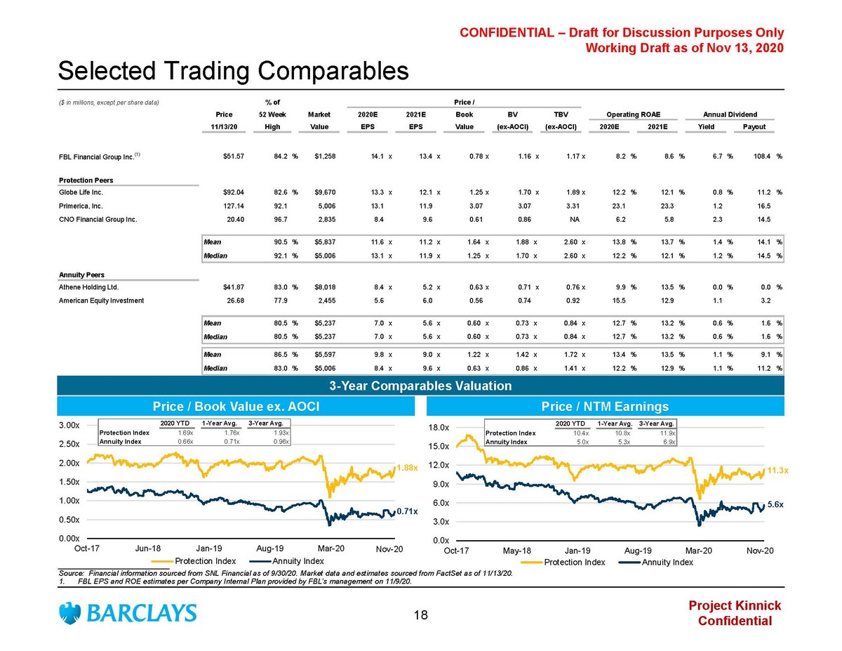 Project Kinnick Confidential CONFIDENTIAL – Draft for Discussion Purposes Only Working Draft as of Nov 13, 2020 Selected Trading Comparables ___________________________ Source: Financial information sourced from SNL Financial as of 9/30/20. Market data and estimates sourced from FactSet as of 11/13/20 . 1. FBL EPS and ROE estimates per Company Internal Plan provided by FBL’s management on 11/9/20. Price / Book Value ex. AOCI 3 - Year Comparables Valuation 0.0x 3.0x 6.0x 9.0x 12.0x 15.0x 18.0x Oct-17 May-18 Jan-19 Aug-19 Mar-20 Oct-20 Protection Index Annuity Index Price / NTM Earnings 0.00x 0.50x 1.00x 1.50x 2.00x 2.50x 3.00x Oct-17 Jun-18 Jan-19 Aug-19 Mar-20 Oct-20 Protection Index Annuity Index ($ in millions, except per share data) % of Price / Price 52 Week Market 2020E 2021E Book BV TBV Operating ROAE Annual Dividend 11/13/20 High Value EPS EPS Value (ex-AOCI) (ex-AOCI) 2020E 2021E Yield Payout Sort By Market Value FBL Financial Group Inc. (1) $51.57 84.2 % $1,258 14.1 x 13.4 x 0.78x 1.16 x 1.17x 8.2 % 8.6 % 6.7 % 108.4 % Protection Peers Globe Life Inc. $92.04 82.6 % $9,670 13.3 x 12.1 x 1.25x 1.70 x 1.89x 12.2 % 12.1 % 0.8 % 11.2 % Primerica, Inc. 127.14 92.1 5,006 13.1 11.9 3.07 3.07 3.31 23.1 23.3 1.2 16.5 CNO Financial Group Inc. 20.40 96.7 2,835 8.4 9.6 0.61 0.86 NA 6.2 5.8 2.3 14.5 Mean 90.5 % $5,837 11.6 x 11.2 x 1.64 x 1.88 x 2.60 x 13.8 % 13.7 % 1.4 % 14.1 % Median 92.1 % $5,006 13.1 x 11.9 x 1.25 x 1.70 x 2.60 x 12.2 % 12.1 % 1.2 % 14.5 % Annuity Peers Athene Holding Ltd. $41.87 83.0 % $8,018 8.4 x 5.2 x 0.63x 0.71 x 0.76x 9.9 % 13.5 % 0.0 % 0.0 % American Equity Investment 26.68 77.9 2,455 5.6 6.0 0.56 0.74 0.92 15.5 12.9 1.1 3.2 Mean 80.5 % $5,237 7.0 x 5.6 x 0.60 x 0.73 x 0.84 x 12.7 % 13.2 % 0.6 % 1.6 % Median 80.5 % $5,237 7.0 x 5.6 x 0.60 x 0.73 x 0.84 x 12.7 % 13.2 % 0.6 % 1.6 % Mean 86.5 % $5,597 9.8 x 9.0 x 1.22 x 1.42 x 1.72 x 13.4 % 13.5 % 1.1 % 9.1 % Median 83.0 % $5,006 8.4 x 9.6 x 0.63 x 0.86 x 1.41 x 12.2 % 12.9 % 1.1 % 11.2 % 2020 YTD 1-Year Avg. 3-Year Avg. Protection Index 1.69x 1.76x 1.93x Annuity Index 0.66x 0.71x 0.96x 2020 YTD 1-Year Avg. 3-Year Avg. Protection Index 10.4x 10.8x 11.9x Annuity Index 5.0x 5.3x 6.9x 1.88x 11.3x 0.71x 5.6x Nov - 20 Nov - 20 18