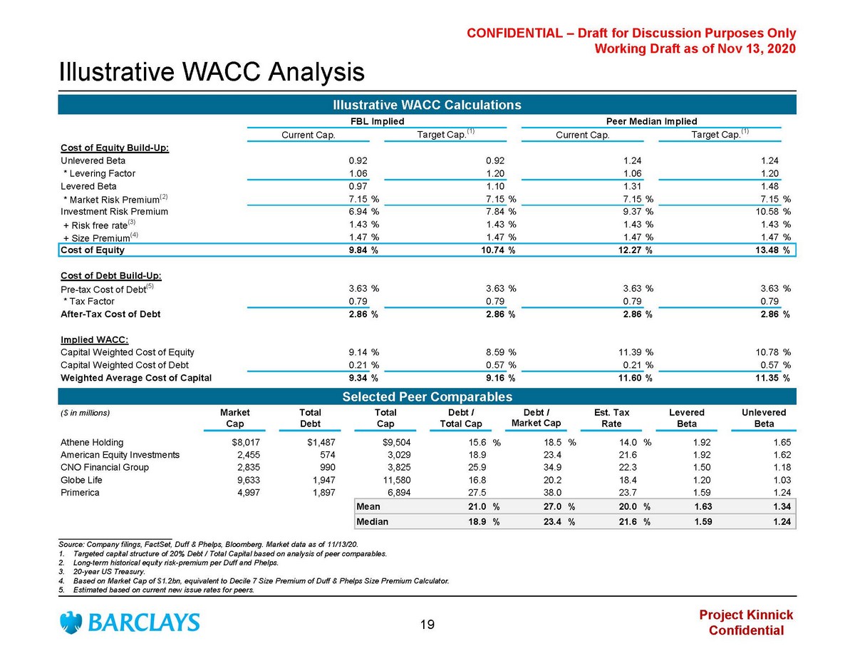 Project Kinnick Confidential CONFIDENTIAL – Draft for Discussion Purposes Only Working Draft as of Nov 13, 2020 Illustrative WACC Analysis Illustrative WACC Calculations FBL Implied Peer Median Implied Peer Avg. Implied Current Cap. Target Cap. (1) Current Cap. Target Cap. (1) Cost of Equity Build-Up: Unlevered Beta 0.92 0.92 1.24 1.24 * Levering Factor 1.06 1.20 1.06 1.20 Levered Beta 0.97 1.10 1.31 1.48 * Market Risk Premium (2) 7.15% 7.15% 7.15% 7.15% Investment Risk Premium 6.94% 7.84% 9.37% 10.58% + Risk free rate (3) 1.43% 1.43% 1.43% 1.43% + Size Premium (4) 1.47% 1.47% 1.47% 1.47% Cost of Equity 9.84% 10.74% 12.27% 13.48% Cost of Debt Build-Up: Pre-tax Cost of Debt (5) 3.63% 3.63% 3.63% 3.63% * Tax Factor 0.79 0.79 0.79 0.79 After-Tax Cost of Debt 2.86% 2.86% 2.86% 2.86% Implied WACC: Capital Weighted Cost of Equity 9.14% 8.59% 11.39% 10.78% Capital Weighted Cost of Debt 0.21% 0.57% 0.21% 0.57% Weighted Average Cost of Capital 9.34% 9.16% 11.60% 11.35% Selected Peer Comparables ($ in millions) Market Total Total Debt / Debt / Est. Tax Levered Unlevered Cap Debt Cap Total Cap Market Cap Rate Beta Beta Athene Holding $8,017 $1,487 $9,504 15.6 % 18.5 % 14.0 % 1.92 1.65 American Equity Investments 2,455 574 3,029 18.9 23.4 21.6 1.92 1.62 CNO Financial Group 2,835 990 3,825 25.9 34.9 22.3 1.50 1.18 Globe Life 9,633 1,947 11,580 16.8 20.2 18.4 1.20 1.03 Primerica 4,997 1,897 6,894 27.5 38.0 23.7 1.59 1.24 Mean 21.0 % 27.0 % 20.0 % 1.63 1.34 Median 18.9 % 23.4 % 21.6 % 1.59 1.24 ___________________________ Source: Company filings, FactSet, Duff & Phelps, Bloomberg. Market data as of 11/13/20. 1. Targeted capital structure of 20% Debt / Total Capital based on analysis of peer comparables. 2. Long - term historical equity risk - premium per Duff and Phelps. 3. 20 - year US Treasury. 4. Based on Market Cap of $1.2bn, equivalent to Decile 7 Size Premium of Duff & Phelps Size Premium Calculator. 5. Estimated based on current new issue rates for peers. 19