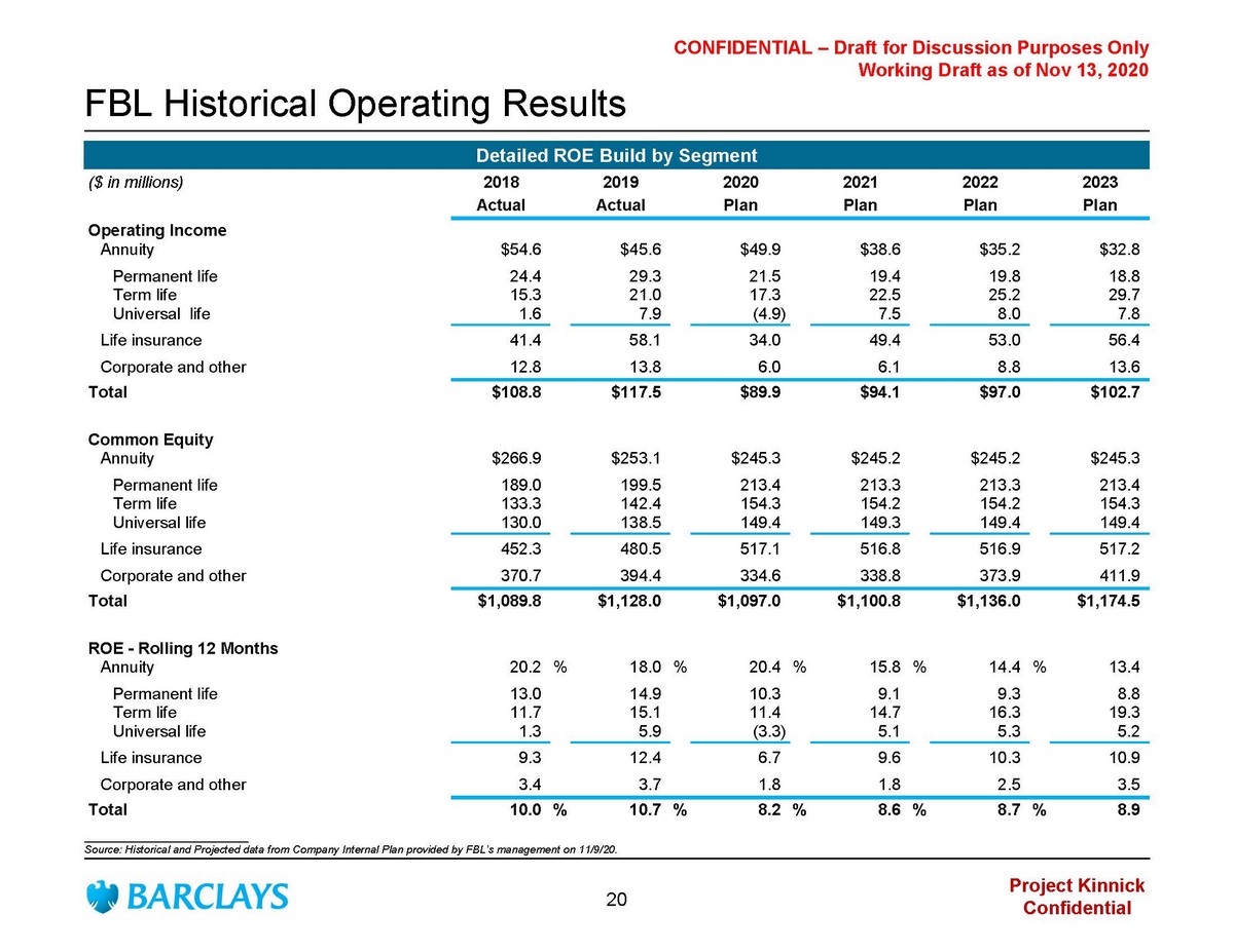 Project Kinnick Confidential CONFIDENTIAL – Draft for Discussion Purposes Only Working Draft as of Nov 13, 2020 FBL Historical Operating Results Detailed ROE Build by Segment ($ in millions) 2018 2019 2020 2021 2022 2023 Actual Actual Plan Plan Plan Plan Operating Income Annuity $54.6 $45.6 $49.9 $38.6 $35.2 $32.8 Permanent life 24.4 29.3 21.5 19.4 19.8 18.8 Term life 15.3 21.0 17.3 22.5 25.2 29.7 Universal life 1.6 7.9 (4.9) 7.5 8.0 7.8 Life insurance 41.4 58.1 34.0 49.4 53.0 56.4 Corporate and other 12.8 13.8 6.0 6.1 8.8 13.6 Total $108.8 $117.5 $89.9 $94.1 $97.0 $102.7 Common Equity Annuity $266.9 $253.1 $245.3 $245.2 $245.2 $245.3 Permanent life 189.0 199.5 213.4 213.3 213.3 213.4 Term life 133.3 142.4 154.3 154.2 154.2 154.3 Universal life 130.0 138.5 149.4 149.3 149.4 149.4 Life insurance 452.3 480.5 517.1 516.8 516.9 517.2 Corporate and other 370.7 394.4 334.6 338.8 373.9 411.9 Total $1,089.8 $1,128.0 $1,097.0 $1,100.8 $1,136.0 $1,174.5 ROE - Rolling 12 Months Annuity 20.2 % 18.0 % 20.4 % 15.8 % 14.4 % 13.4 Permanent life 13.0 14.9 10.3 9.1 9.3 8.8 Term life 11.7 15.1 11.4 14.7 16.3 19.3 Universal life 1.3 5.9 (3.3) 5.1 5.3 5.2 Life insurance 9.3 12.4 6.7 9.6 10.3 10.9 Corporate and other 3.4 3.7 1.8 1.8 2.5 3.5 Total 10.0 % 10.7 % 8.2 % 8.6 % 8.7 % 8.9 ___________________________ Source: Historical and Projected data from Company Internal Plan provided by FBL’s management on 11/9/20. 20