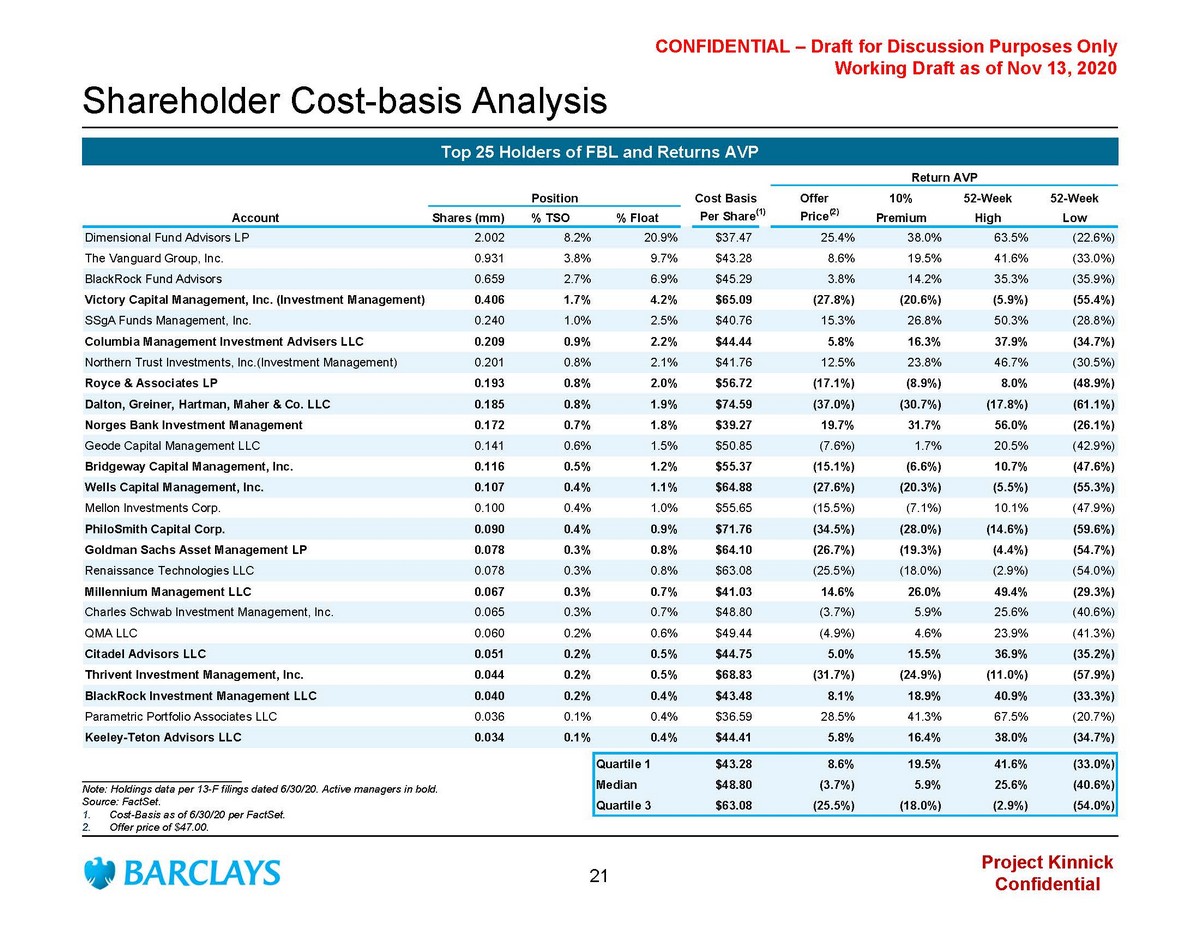 Project Kinnick Confidential CONFIDENTIAL – Draft for Discussion Purposes Only Working Draft as of Nov 13, 2020 Shareholder Cost - basis Analysis ___________________________ Note: Holdings data per 13 - F filings dated 6/30/20. Active managers in bold. Source: FactSet . 1. Cost - Basis as of 6/30/20 per FactSet . 2. Offer price of $47.00. Return AVP Position Cost Basis Offer 10% 52-Week 52-Week Account Shares (mm) % TSO % Float Per Share (1) Price (2) Premium High Low Dimensional Fund Advisors LP 2.002 8.2% 20.9% $37.47 25.4% 38.0% 63.5% (22.6%) The Vanguard Group, Inc. 0.931 3.8% 9.7% $43.28 8.6% 19.5% 41.6% (33.0%) BlackRock Fund Advisors 0.659 2.7% 6.9% $45.29 3.8% 14.2% 35.3% (35.9%) Victory Capital Management, Inc. (Investment Management) 0.406 1.7% 4.2% $65.09 (27.8%) (20.6%) (5.9%) (55.4%) SSgA Funds Management, Inc. 0.240 1.0% 2.5% $40.76 15.3% 26.8% 50.3% (28.8%) Columbia Management Investment Advisers LLC 0.209 0.9% 2.2% $44.44 5.8% 16.3% 37.9% (34.7%) Northern Trust Investments, Inc.(Investment Management) 0.201 0.8% 2.1% $41.76 12.5% 23.8% 46.7% (30.5%) Royce & Associates LP 0.193 0.8% 2.0% $56.72 (17.1%) (8.9%) 8.0% (48.9%) Dalton, Greiner, Hartman, Maher & Co. LLC 0.185 0.8% 1.9% $74.59 (37.0%) (30.7%) (17.8%) (61.1%) Norges Bank Investment Management 0.172 0.7% 1.8% $39.27 19.7% 31.7% 56.0% (26.1%) Geode Capital Management LLC 0.141 0.6% 1.5% $50.85 (7.6%) 1.7% 20.5% (42.9%) Bridgeway Capital Management, Inc. 0.116 0.5% 1.2% $55.37 (15.1%) (6.6%) 10.7% (47.6%) Wells Capital Management, Inc. 0.107 0.4% 1.1% $64.88 (27.6%) (20.3%) (5.5%) (55.3%) Mellon Investments Corp. 0.100 0.4% 1.0% $55.65 (15.5%) (7.1%) 10.1% (47.9%) PhiloSmith Capital Corp. 0.090 0.4% 0.9% $71.76 (34.5%) (28.0%) (14.6%) (59.6%) Goldman Sachs Asset Management LP 0.078 0.3% 0.8% $64.10 (26.7%) (19.3%) (4.4%) (54.7%) Renaissance Technologies LLC 0.078 0.3% 0.8% $63.08 (25.5%) (18.0%) (2.9%) (54.0%) Millennium Management LLC 0.067 0.3% 0.7% $41.03 14.6% 26.0% 49.4% (29.3%) Charles Schwab Investment Management, Inc. 0.065 0.3% 0.7% $48.80 (3.7%) 5.9% 25.6% (40.6%) QMA LLC 0.060 0.2% 0.6% $49.44 (4.9%) 4.6% 23.9% (41.3%) Citadel Advisors LLC 0.051 0.2% 0.5% $44.75 5.0% 15.5% 36.9% (35.2%) Thrivent Investment Management, Inc. 0.044 0.2% 0.5% $68.83 (31.7%) (24.9%) (11.0%) (57.9%) BlackRock Investment Management LLC 0.040 0.2% 0.4% $43.48 8.1% 18.9% 40.9% (33.3%) Parametric Portfolio Associates LLC 0.036 0.1% 0.4% $36.59 28.5% 41.3% 67.5% (20.7%) Keeley-Teton Advisors LLC 0.034 0.1% 0.4% $44.41 5.8% 16.4% 38.0% (34.7%) Quartile 1 $43.28 8.6% 19.5% 41.6% (33.0%) Median $48.80 (3.7%) 5.9% 25.6% (40.6%) Quartile 3 $63.08 (25.5%) (18.0%) (2.9%) (54.0%) Top 25 Holders of FBL and Returns AVP 21