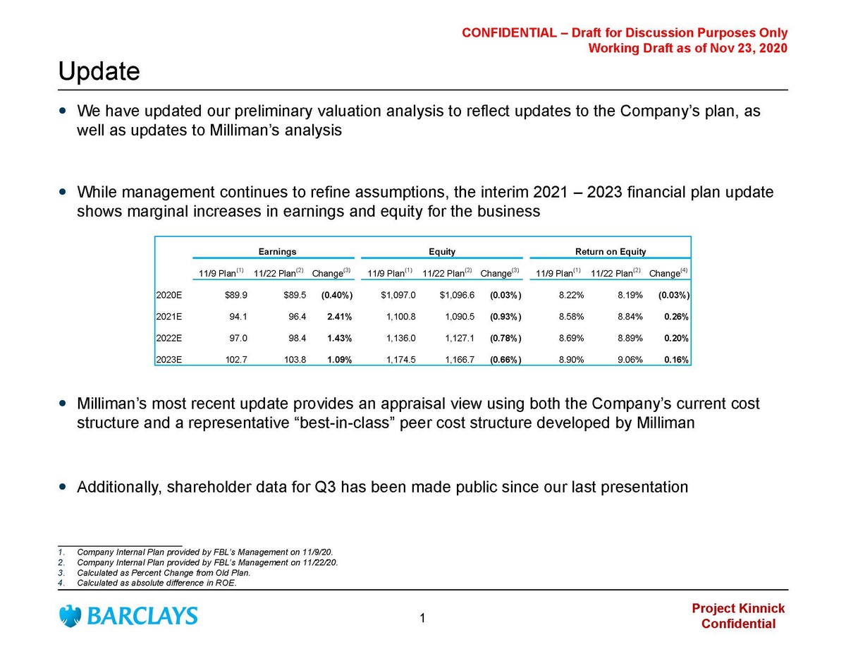 Project Kinnick Confidential CONFIDENTIAL – Draft for Discussion Purposes Only Working Draft as of Nov 23, 2020 We have updated our preliminary valuation analysis to reflect updates to the Company’s plan, as well as updates to Milliman’s analysis While management continues to refine assumptions, the interim 2021 – 2023 financial plan update shows marginal increases in earnings and equity for the business Milliman’s most recent update provides an appraisal view using both the Company’s current cost structure and a representative “best - in - class” peer cost structure developed by Milliman Additionally, shareholder data for Q3 has been made public since our last presentation Update __________________________ 1. Company Internal Plan provided by FBL’s Management on 11/9/20. 2. Company Internal Plan provided by FBL’s Management on 11/22/20. 3. Calculated as Percent Change from Old Plan. 4. Calculated as absolute difference in ROE. Earnings Equity Return on Equity 11/9 Plan (1) 11/22 Plan (2) Change (3) 11/9 Plan (1) 11/22 Plan (2) Change (3) 11/9 Plan (1) 11/22 Plan (2) Change (4) 2020E $89.9 $89.5 (0.40%) $1,097.0 $1,096.6 (0.03%) 8.22% 8.19% (0.03%) 2021E 94.1 96.4 2.41% 1,100.8 1,090.5 (0.93%) 8.58% 8.84% 0.26% 2022E 97.0 98.4 1.43% 1,136.0 1,127.1 (0.78%) 8.69% 8.89% 0.20% 2023E 102.7 103.8 1.09% 1,174.5 1,166.7 (0.66%) 8.90% 9.06% 0.16% 1