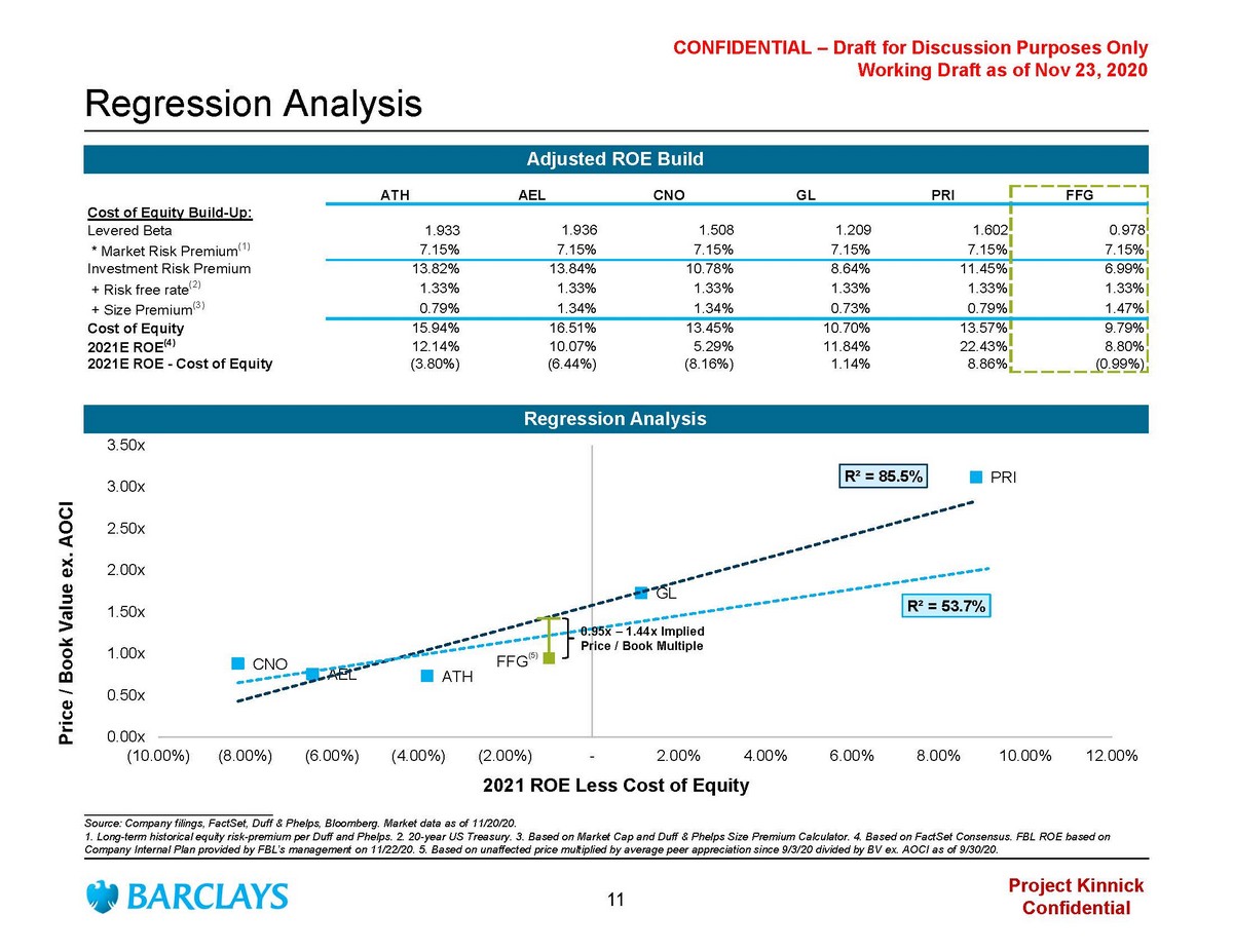 Project Kinnick Confidential CONFIDENTIAL – Draft for Discussion Purposes Only Working Draft as of Nov 23, 2020 ATH AEL CNO GL PRI FFG R² = 85.5% R² = 53.7% 0.00x 0.50x 1.00x 1.50x 2.00x 2.50x 3.00x 3.50x (10.00%) (8.00%) (6.00%) (4.00%) (2.00%) - 2.00% 4.00% 6.00% 8.00% 10.00% 12.00% ___________________________ Source: Company filings, FactSet, Duff & Phelps, Bloomberg. Market data as of 11/20/20. 1. Long - term historical equity risk - premium per Duff and Phelps. 2. 20 - year US Treasury. 3. Based on Market Cap and Duff & Phelp s Size Premium Calculator. 4. Based on FactSet Consensus. FBL ROE based on Company Internal Plan provided by FBL’s management on 11/22/20 . 5. Based on unaffected price multiplied by average peer appreciation since 9/3/20 divided by BV ex. AOCI as of 9/30/20. Regression Analysis Regression Analysis Price / Book Value ex. AOCI 2021 ROE Less Cost of Equity Adjusted ROE Build ATH AEL CNO GL PRI FFG Cost of Equity Build-Up: Levered Beta 1.933 1.936 1.508 1.209 1.602 0.978 * Market Risk Premium (1) 7.15% 7.15% 7.15% 7.15% 7.15% 7.15% Investment Risk Premium 13.82% 13.84% 10.78% 8.64% 11.45% 6.99% + Risk free rate (2) 1.33% 1.33% 1.33% 1.33% 1.33% 1.33% + Size Premium (3) 0.79% 1.34% 1.34% 0.73% 0.79% 1.47% Cost of Equity 15.94% 16.51% 13.45% 10.70% 13.57% 9.79% 2021E ROE (4) 12.14% 10.07% 5.29% 11.84% 22.43% 8.80% 2021E ROE - Cost of Equity (3.80%) (6.44%) (8.16%) 1.14% 8.86% (0.99%) (5) 0.95x – 1.44x Implied Price / Book Multiple 11