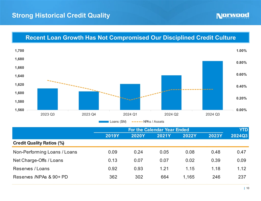 Strong Historical Credit Quality Recent Loan Growth Has Not Compromised Our Disciplined Credit Culture 1,700 1.00% 1,680 0.80% 1,660 0.60% 1,640 1,620 0.40% 1,600 0.20% 1,580 1,560 0.00% 2023 Q3 2023 Q4 2024 Q1 2024 Q2 2024 Q3 Loans ($M) NPAs / Assets For the Calendar Year Ended YTD 2019Y 2020Y 2021Y 2022Y 2023Y 2024Q3 Credit Quality Ratios (%) Non-Performing Loans / Loans 0.09 0.24 0.05 0.08 0.48 0.47 Net Charge-Offs / Loans 0.13 0.07 0.07 0.02 0.39 0.09 Reserves / Loans 0.92 0.93 1.21 1.15 1.18 1.12 Reserves /NPAs & 90+ PD 362 302 664 1,165 246 237 | 10