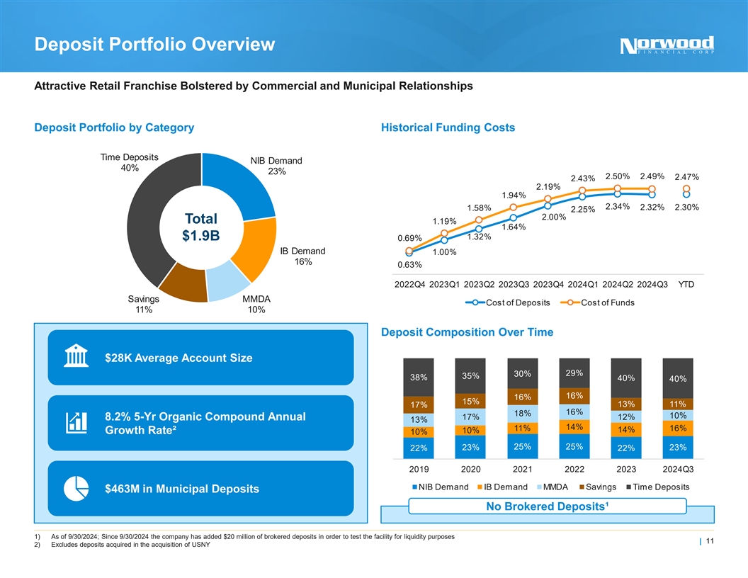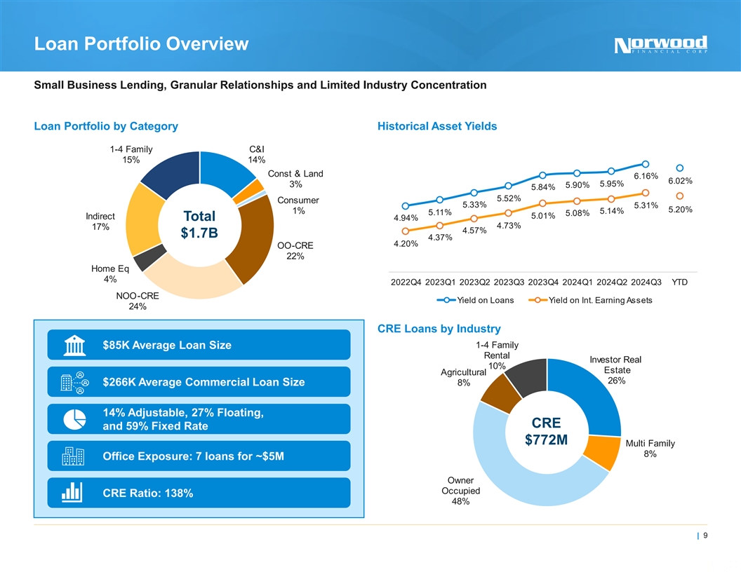 Historical Growth and Expansion A History of De Novo Growth and Successful Acquisitions 2024: Renovating new location in Forty Fort, PA scheduled to open in Acquired Branches Q1 2025 2020: Acquired USNY and Bank NY of Cooperstown and Bank of Finger Lakes brands $2.3B $2.2B $2.1B $2.0B $1.9B PA 2016: Acquired National Bank of Delaware County (NBDC) $1.2B $1.2B $1.1B $1.1B 2011: Acquired North Penn Bank $0.8B $0.7B $0.7B $0.7B $0.7B $0.5B 2010Y 2011Y 2012Y 2013Y 2014Y 2015Y 2016Y 2017Y 2018Y 2019Y 2020Y 2021Y 2022Y 2023Y 2024Q3 Total Assets 1) Excludes growth attributed to acquisitions from 2010 through 2023 | 8 Note: Acquired branches on map reflect the branches existing today