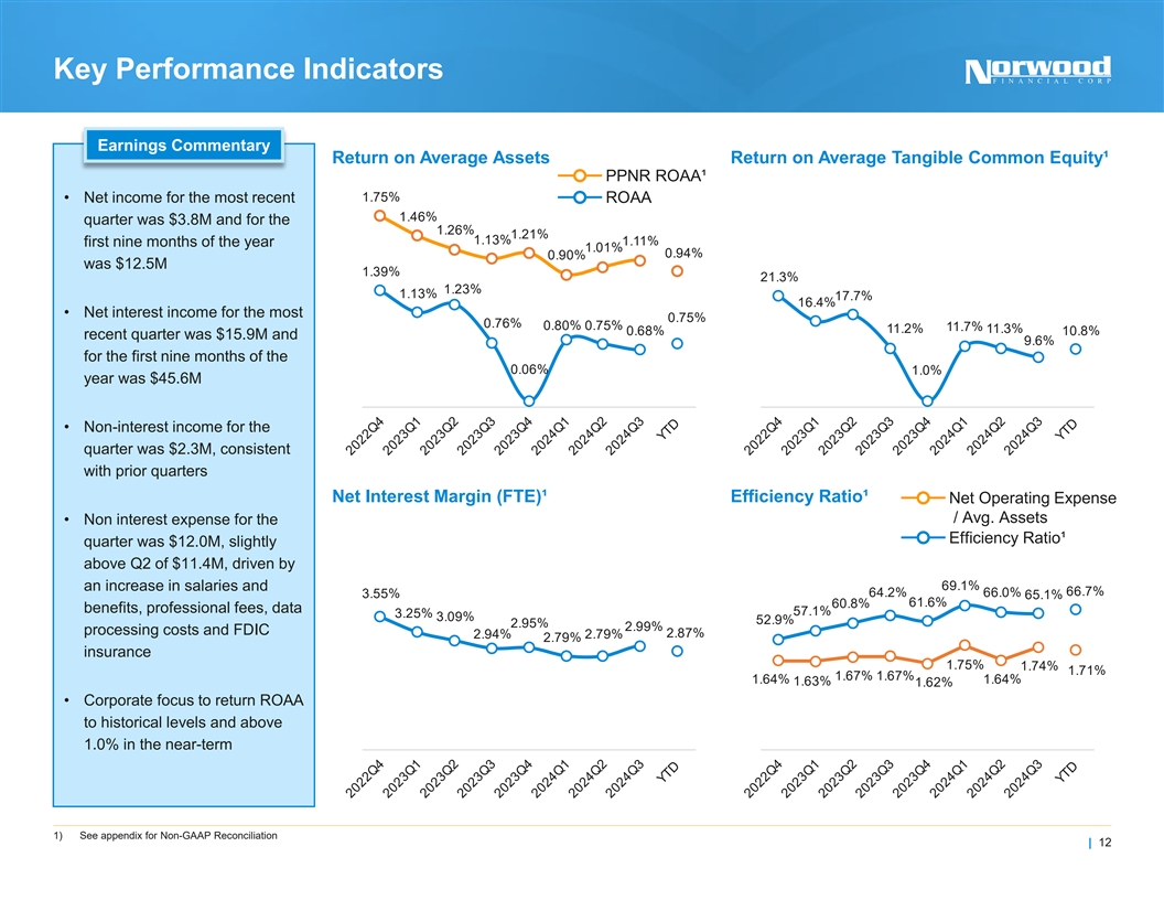 Deposit Portfolio Overview Attractive Retail Franchise Bolstered by Commercial and Municipal Relationships Deposit Portfolio by Category Historical Funding Costs Time Deposits NIB Demand 40% 23% 2.50% 2.49% 2.47% 2.43% 2.19% 1.94% 2.34% 1.58% 2.32% 2.30% 2.25% 2.00% Total 1.19% 1.64% 1.32% $1.9B 0.69% IB Demand 1.00% 16% 0.63% 2022Q4 2023Q1 2023Q2 2023Q3 2023Q4 2024Q1 2024Q2 2024Q3 YTD Savings MMDA Cost of Deposits Cost of Funds 11% 10% Deposit Composition Over Time $28K Average Account Size 29% 30% 35% 38% 40% 40% 16% 16% 15% 13% 11% 17% 16% 18% 10% 8.2% 5-Yr Organic Compound Annual 17% 12% 13% 14% 11% 16% 14% 10% Growth Rate² 10% 25% 25% 23% 23% 22% 22% 2019 2020 2021 2022 2023 2024Q3 NIB Demand IB Demand MMDA Savings Time Deposits $463M in Municipal Deposits No Brokered Deposits¹ 1) As of 9/30/2024; Since 9/30/2024 the company has added $20 million of brokered deposits in order to test the facility for liquidity purposes | 11 2) Excludes deposits acquired in the acquisition of USNY