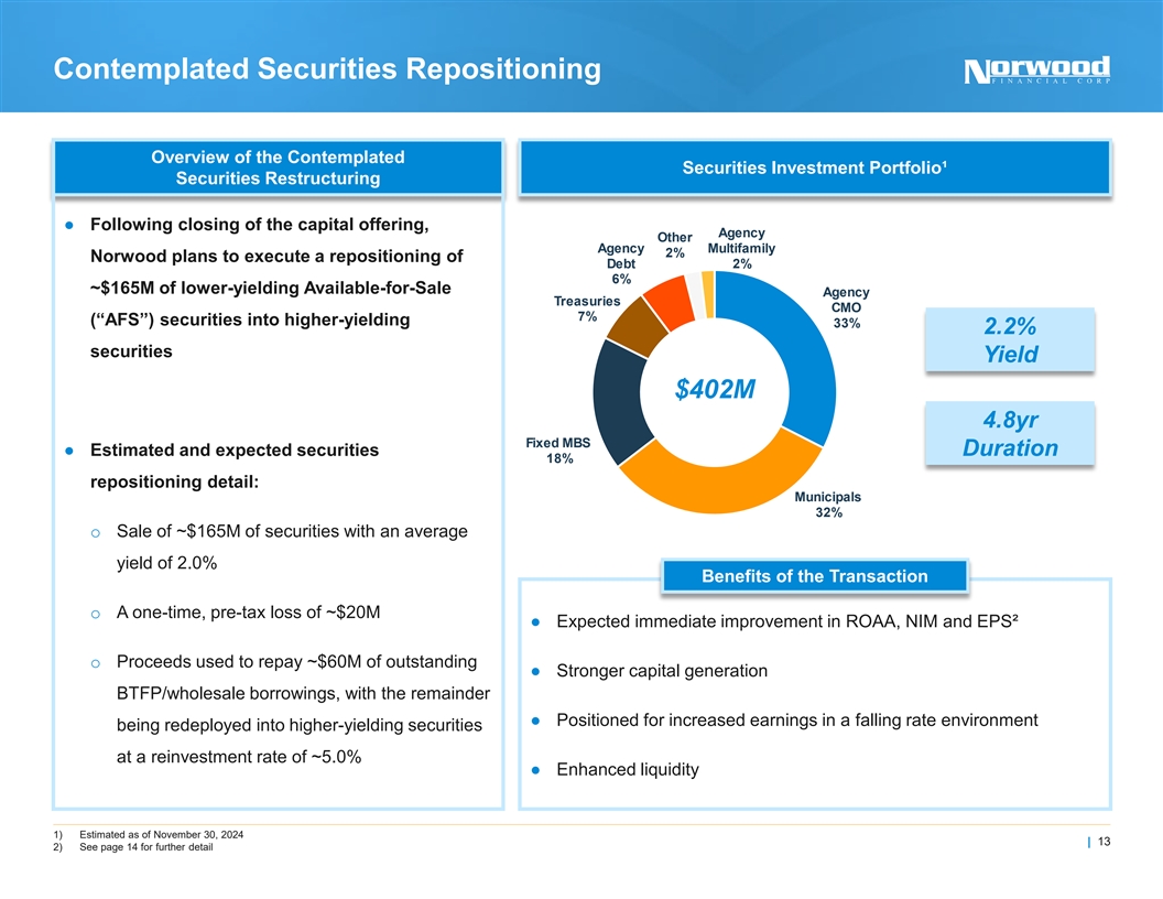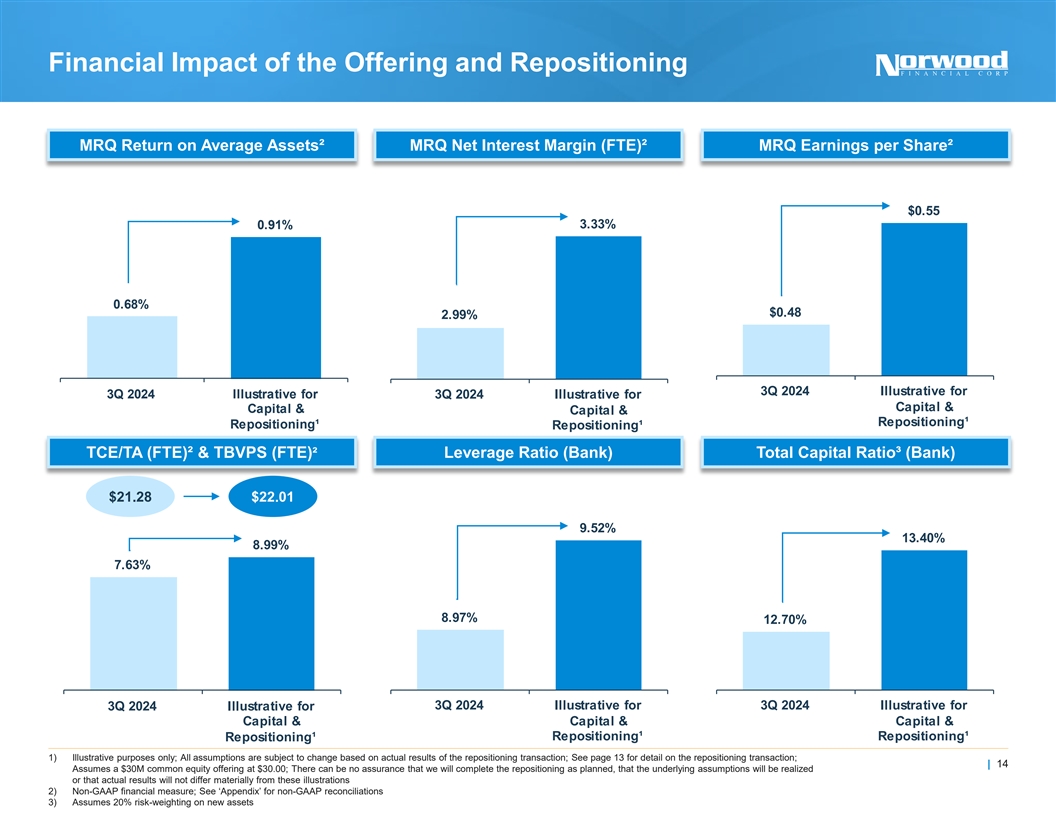 Contemplated Securities Repositioning Overview of the Contemplated Securities Investment Portfolio¹ Securities Restructuring ● Following closing of the capital offering, Agency Other Agency Multifamily 2% Norwood plans to execute a repositioning of Debt 2% 6% ~$165M of lower-yielding Available-for-Sale Agency Treasuries CMO 7% (“AFS”) securities into higher-yielding 33% 2.2% securities Yield $402M 4.8yr Fixed MBS ● Estimated and expected securities Duration 18% repositioning detail: Municipals 32% o Sale of ~$165M of securities with an average yield of 2.0% Benefits of the Transaction o A one-time, pre-tax loss of ~$20M ● Expected immediate improvement in ROAA, NIM and EPS² o Proceeds used to repay ~$60M of outstanding ● Stronger capital generation BTFP/wholesale borrowings, with the remainder ● Positioned for increased earnings in a falling rate environment being redeployed into higher-yielding securities at a reinvestment rate of ~5.0% ● Enhanced liquidity 1) Estimated as of November 30, 2024 | 13 2) See page 14 for further detail