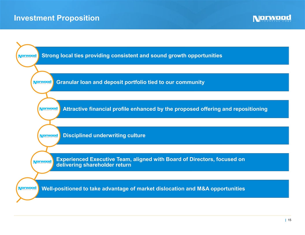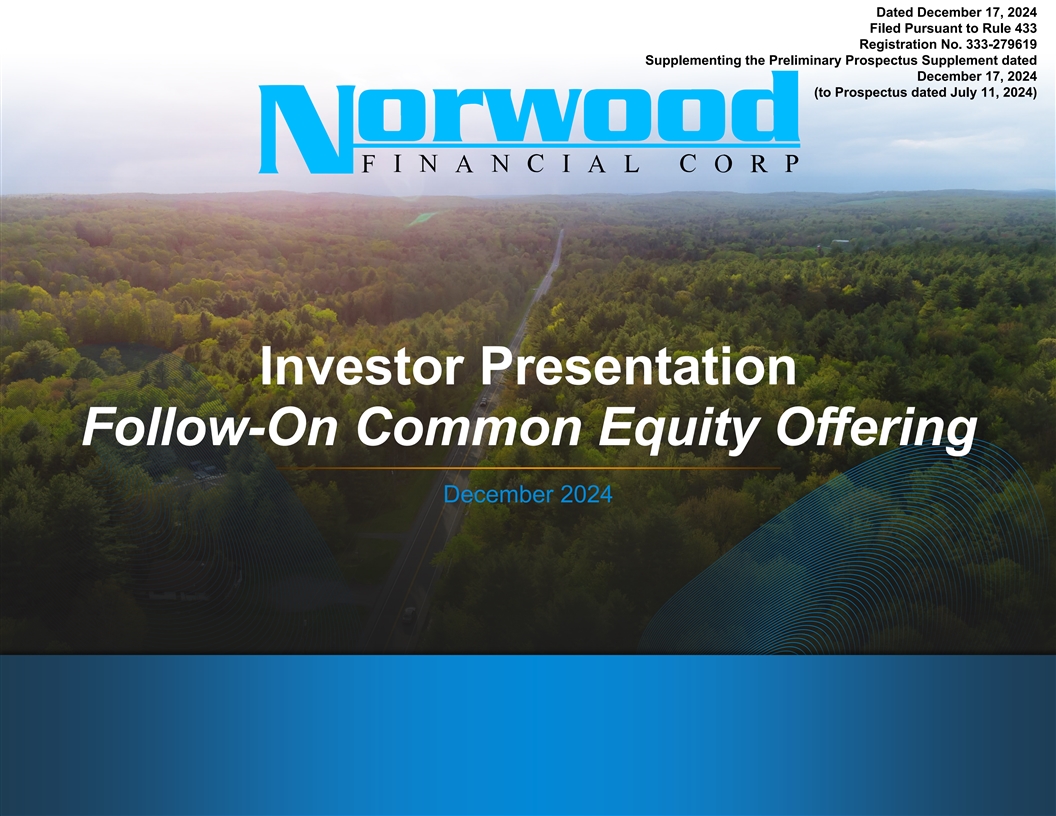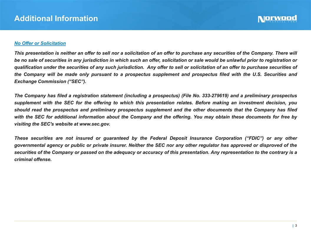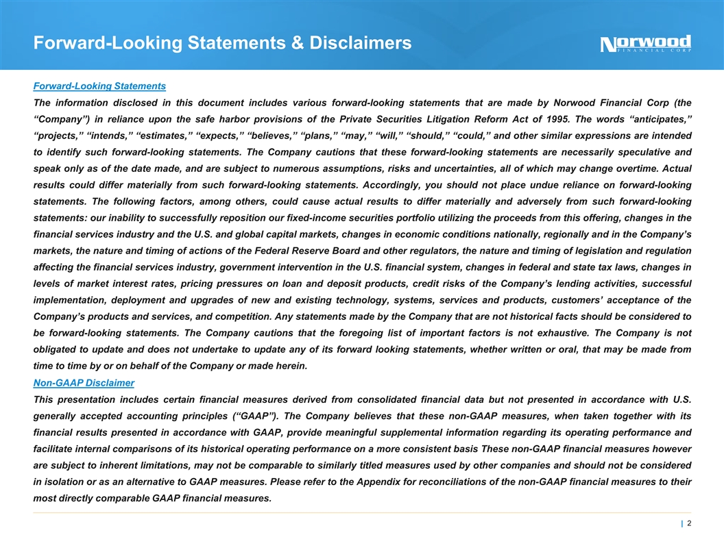 Forward-Looking Statements & Disclaimers Forward-Looking Statements The information disclosed in this document includes various forward-looking statements that are made by Norwood Financial Corp (the “Company”) in reliance upon the safe harbor provisions of the Private Securities Litigation Reform Act of 1995. The words “anticipates,” “projects,” “intends,” “estimates,” “expects,” “believes,” “plans,” “may,” “will,” “should,” “could,” and other similar expressions are intended to identify such forward-looking statements. The Company cautions that these forward-looking statements are necessarily speculative and speak only as of the date made, and are subject to numerous assumptions, risks and uncertainties, all of which may change overtime. Actual results could differ materially from such forward-looking statements. Accordingly, you should not place undue reliance on forward-looking statements. The following factors, among others, could cause actual results to differ materially and adversely from such forward-looking statements: our inability to successfully reposition our fixed-income securities portfolio utilizing the proceeds from this offering, changes in the financial services industry and the U.S. and global capital markets, changes in economic conditions nationally, regionally and in the Company’s markets, the nature and timing of actions of the Federal Reserve Board and other regulators, the nature and timing of legislation and regulation affecting the financial services industry, government intervention in the U.S. financial system, changes in federal and state tax laws, changes in levels of market interest rates, pricing pressures on loan and deposit products, credit risks of the Company’s lending activities, successful implementation, deployment and upgrades of new and existing technology, systems, services and products, customers’ acceptance of the Company’s products and services, and competition. Any statements made by the Company that are not historical facts should be considered to be forward-looking statements. The Company cautions that the foregoing list of important factors is not exhaustive. The Company is not obligated to update and does not undertake to update any of its forward looking statements, whether written or oral, that may be made from time to time by or on behalf of the Company or made herein. Non-GAAP Disclaimer This presentation includes certain financial measures derived from consolidated financial data but not presented in accordance with U.S. generally accepted accounting principles (“GAAP”). The Company believes that these non-GAAP measures, when taken together with its financial results presented in accordance with GAAP, provide meaningful supplemental information regarding its operating performance and facilitate internal comparisons of its historical operating performance on a more consistent basis These non-GAAP financial measures however are subject to inherent limitations, may not be comparable to similarly titled measures used by other companies and should not be considered in isolation or as an alternative to GAAP measures. Please refer to the Appendix for reconciliations of the non-GAAP financial measures to their most directly comparable GAAP financial measures. | 2