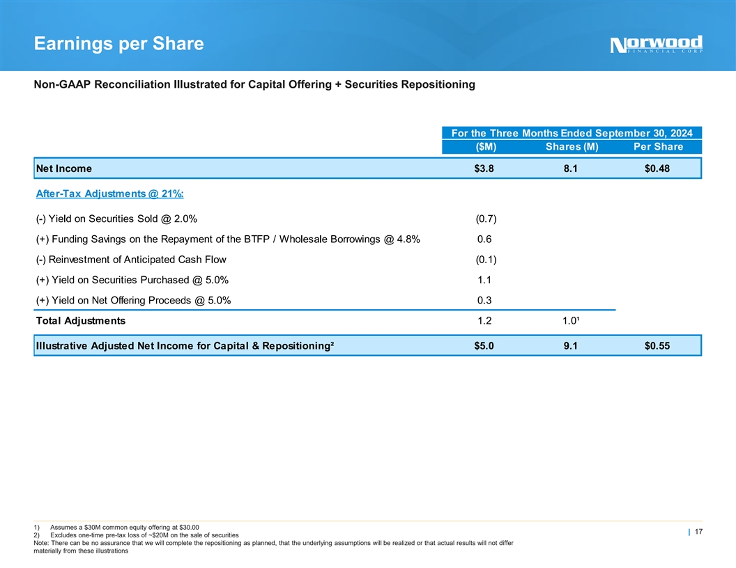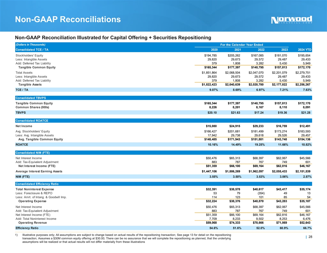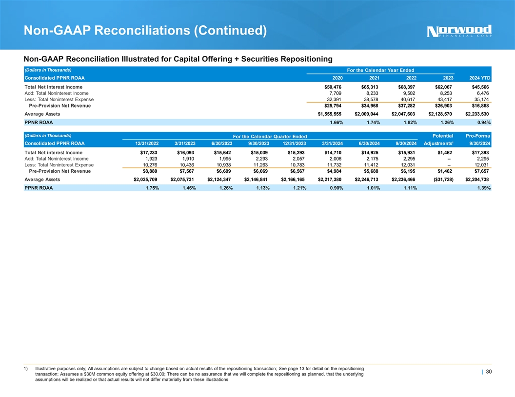 Non-GAAP Reconciliations Non-GAAP Reconciliation Illustrated for Capital Offering + Securities Repositioning (Dollars in Thousands) Potential Pro-Forma For the Calendar Quarter Ended Consolidated TCE / TA 12/31/2022 3/31/2023 6/30/2023 9/30/2023 12/31/2023 3/31/2024 6/30/2024 9/30/2024 Adjustments¹ 9/30/2024 Stockholders' Equity $167,085 $176,415 $173,424 $164,702 $181,070 $181,213 $182,187 $195,654 $27,900 $223,554 Less: Intangible Assets 29,572 29,549 29,526 29,506 29,487 29,468 29,449 29,433 -- 29,433 Add: Deferred Tax Liability 3,282 2,928 5,996 5,937 5,430 5,430 6,026 5,949 -- 5,949 Tangible Common Equity $140,795 $149,794 $149,894 $141,133 $157,013 $157,175 $158,764 $172,170 $27,900 $200,070 Total Assets $2,047,070 $2,104,363 $2,141,765 $2,179,998 $2,201,079 $2,260,423 $2,235,316 $2,279,751 ($31,728) $2,248,023 Less: Intangible Assets 29,572 29,549 29,526 29,506 29,487 29,468 29,449 29,433 -- 29,433 Add: Deferred Tax Liability 3,282 2,928 5,996 5,937 5,430 5,430 6,026 5,949 -- 5,949 Tangible Assets $2,020,780 $2,077,742 $2,118,235 $2,156,429 $2,177,022 $2,236,385 $2,211,893 $2,256,267 ($31,728) $2,224,539 TCE / TA 6.97% 7.21% 7.08% 6.54% 7.21% 7.03% 7.18% 7.63% 8.99% Consolidated TBVPS Tangible Common Equity $140,795 $149,794 $149,894 $141,133 $157,013 $157,175 $158,764 $172,170 $27,900 $200,070 Common Shares (000s) 8,167 8,181 8,067 8,069 8,110 8,110 8,092 8,091 1,000 9,091 TBVPS $17.24 $18.31 $18.58 $17.49 $19.36 $19.38 $19.62 $21.28 $22.01 Consolidated ROATCE Net Income $7,140 $5,782 $6,503 $4,119 $355 $4,433 $4,213 $3,844 $1,155 $4,999 Avg. Stockholders' Equity $162,762 $172,334 $177,241 $175,224 $168,320 $182,088 $179,494 $189,135 $27,900 $217,035 Less: Avg. Intangible Assets 29,582 29,559 29,536 29,514 29,495 29,476 29,457 29,440 -- 29,440 Avg. Tangible Common Equity $133,180 $142,775 $147,705 $145,710 $138,825 $152,612 $150,037 $159,695 $27,900 $187,595 ROATCE 21.27% 16.42% 17.66% 11.22% 1.01% 11.68% 11.26% 9.58% 10.66% Consolidated NIM (FTE) Net Interest Income $17,233 $16,093 $15,642 $15,039 $15,293 $14,710 $14,925 $15,931 $1,462 $17,393 Add: Tax-Equivalent Adjustment 197 182 187 185 195 195 199 207 -- 207 Net Interest Income (FTE) $17,430 $16,275 $15,829 $15,224 $15,488 $14,905 $15,124 $16,138 $1,462 $17,600 Average Interest Earning Assets $1,963,119 $2,004,159 $2,049,189 $2,070,330 $2,096,871 $2,138,191 $2,168,596 $2,147,873 ($31,728) $2,116,145 NIM (FTE) 3.55% 3.25% 3.09% 2.94% 2.95% 2.79% 2.79% 2.99% 3.33% Consolidated Efficiency Ratio Total Noninterest Expense $10,276 $10,436 $10,938 $11,263 $10,781 $11,732 $11,412 $12,031 -- $12,031 Less: Foreclosure & REPO 7 29 74 (4) (50) 21 (17) 9 -- 9 Less: Amrt. of Intang. & Goodwill Imp. 23 23 23 20 19 19 19 16 -- 16 Operating Expense $10,246 $10,384 $10,841 $11,247 $10,812 $11,692 $11,410 $12,006 -- $12,006 Net Interest Income $17,233 $16,093 $15,642 $15,039 $15,293 $14,710 $14,925 $15,931 $1,462 $17,393 Add: Tax-Equivalent Adjustment 197 182 187 185 195 195 199 207 -- 207 Net Interest Income (FTE) $17,430 $16,275 $15,829 $15,224 $15,488 $14,905 $15,124 $16,138 $1,462 $17,600 Add: Total Noninterest Income excl. 1,926 1,910 1,995 2,293 2,056 2,006 2,175 2,295 -- 2,295 gains/losses on sales of securities Operating Revenue $19,356 $18,185 $17,824 $17,517 $17,544 $16,911 $17,299 $18,433 $1,462 $19,895 Efficiency Ratio 52.9% 57.1% 60.8% 64.2% 61.6% 69.1% 66.0% 65.1% 60.3% 1) Illustrative purposes only; All assumptions are subject to change based on actual results of the repositioning transaction; See page 13 for detail on the repositioning | 29 transaction; Assumes a $30M common equity offering at $30.00; There can be no assurance that we will complete the repositioning as planned, that the underlying assumptions will be realized or that actual results will not differ materially from these illustrations