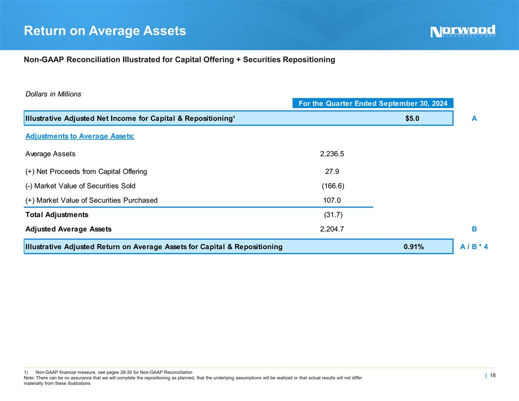 Earnings per Share Non-GAAP Reconciliation Illustrated for Capital Offering + Securities Repositioning For the Three Months Ended September 30, 2024 ($M) Shares (M) Per Share Net Income $3.8 8.1 $0.48 After-Tax Adjustments @ 21%: (-) Yield on Securities Sold @ 2.0% (0.7) (+) Funding Savings on the Repayment of the BTFP / Wholesale Borrowings @ 4.8% 0.6 (-) Reinvestment of Anticipated Cash Flow (0.1) (+) Yield on Securities Purchased @ 5.0% 1.1 (+) Yield on Net Offering Proceeds @ 5.0% 0.3 Total Adjustments 1.2 1.0¹ Illustrative Adjusted Net Income for Capital & Repositioning² $5.0 9.1 $0.55 1) Assumes a $30M common equity offering at $30.00 | 17 2) Excludes one-time pre-tax loss of ~$20M on the sale of securities Note: There can be no assurance that we will complete the repositioning as planned, that the underlying assumptions will be realized or that actual results will not differ materially from these illustrations