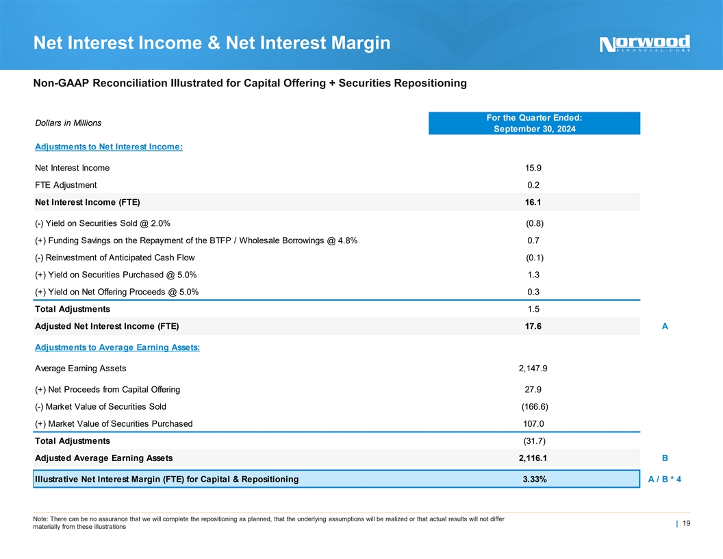 Return on Average Assets Non-GAAP Reconciliation Illustrated for Capital Offering + Securities Repositioning Dollars in Millions For the Quarter Ended September 30, 2024 Illustrative Adjusted Net Income for Capital & Repositioning¹ $5.0 A Adjustments to Average Assets: Average Assets 2,236.5 (+) Net Proceeds from Capital Offering 27.9 (-) Market Value of Securities Sold (166.6) (+) Market Value of Securities Purchased 107.0 Total Adjustments (31.7) Adjusted Average Assets 2,204.7 B Illustrative Adjusted Return on Average Assets for Capital & Repositioning 0.91% A / B * 4 1) Non-GAAP financial measure, see pages 28-30 for Non-GAAP Reconciliation | 18 Note: There can be no assurance that we will complete the repositioning as planned, that the underlying assumptions will be realized or that actual results will not differ materially from these illustrations